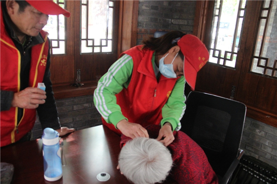 5月2日上午,在我市文明路與交通大道市民驛站,當值的慈孝文化志愿者王大穩(wěn)正為一位老人滴注藥液。