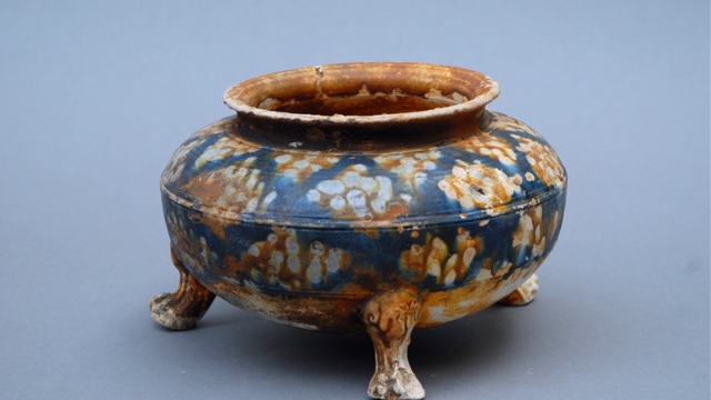 周口市博物館陳列著一件唐代藍(lán)釉三彩爐,它整體施藍(lán)釉,白黃交錯,挺著圓圓的肚子在唐三彩隊伍里高冷“上線”、“C位”出道。