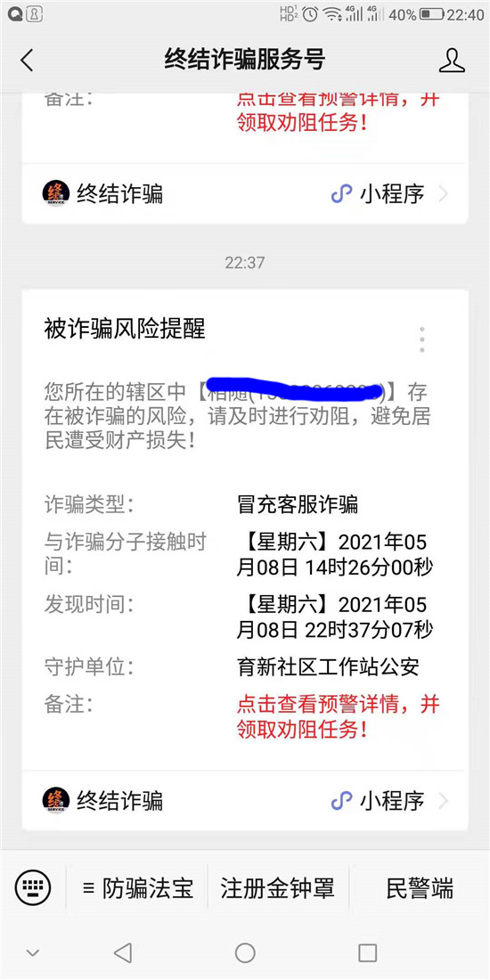 5月8日,鄲城縣公安局南關派出所社區(qū)民警收到“金鐘罩”推送的反詐預警信息,轄區(qū)居民郭某有受騙風險,社區(qū)民警第一時間聯(lián)系郭某核實了解相關情況并及時予以制止。