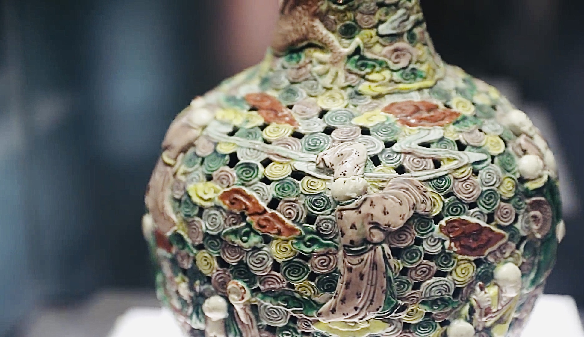 我的出生地在景德鎮(zhèn),但渾身上下又布滿了西亞佛教元素。快看,紅、粉、綠、黃的云朵像玫瑰花一樣緊緊簇?fù)碓谝黄鸩紳M我全身,成了我漂亮的衣裳,人稱五彩祥云。祥云以浮雕、透雕、淺刻等技法,鏤空凹凸,層層交錯(cuò),立體感十足,像是3D版萬紫千紅的花海世界,吸引了十八羅漢來嬉戲打鬧,笑的皺紋都出來了。他們?nèi)宄扇簻愒谝黄?,形態(tài)各異,栩栩如生。他們面額飽滿,鼻寬且豐,兩眼微閉,兩唇微翕,欲言又止,神態(tài)悠然自得,表情異常生動(dòng),衣紋隨風(fēng)飄揚(yáng)、流暢自如、富有動(dòng)感,整個(gè)畫面和諧美好,像身處世外桃源,又如身臨仙境天堂。