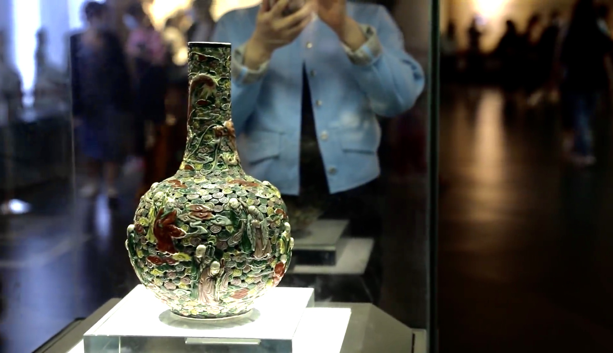 我是五彩透雕十八羅漢云龍瓶,又名古瓷流韻天球瓶。靜謐的空間里,我站在周口市博物館的玻璃展柜里,瞅瞅四周的兄弟姐妹,我偷偷笑了。雖沒有長睫毛和雙眼皮,但我可是個(gè)十足的“混血兒”。技藝精湛、圖案華貴、色彩艷麗,我的稀有性和珍貴性常常讓來訪者驚嘆不已。和青花瓷相比,我更加瑰麗多彩,人稱文物界的“米蘭·可兒”。