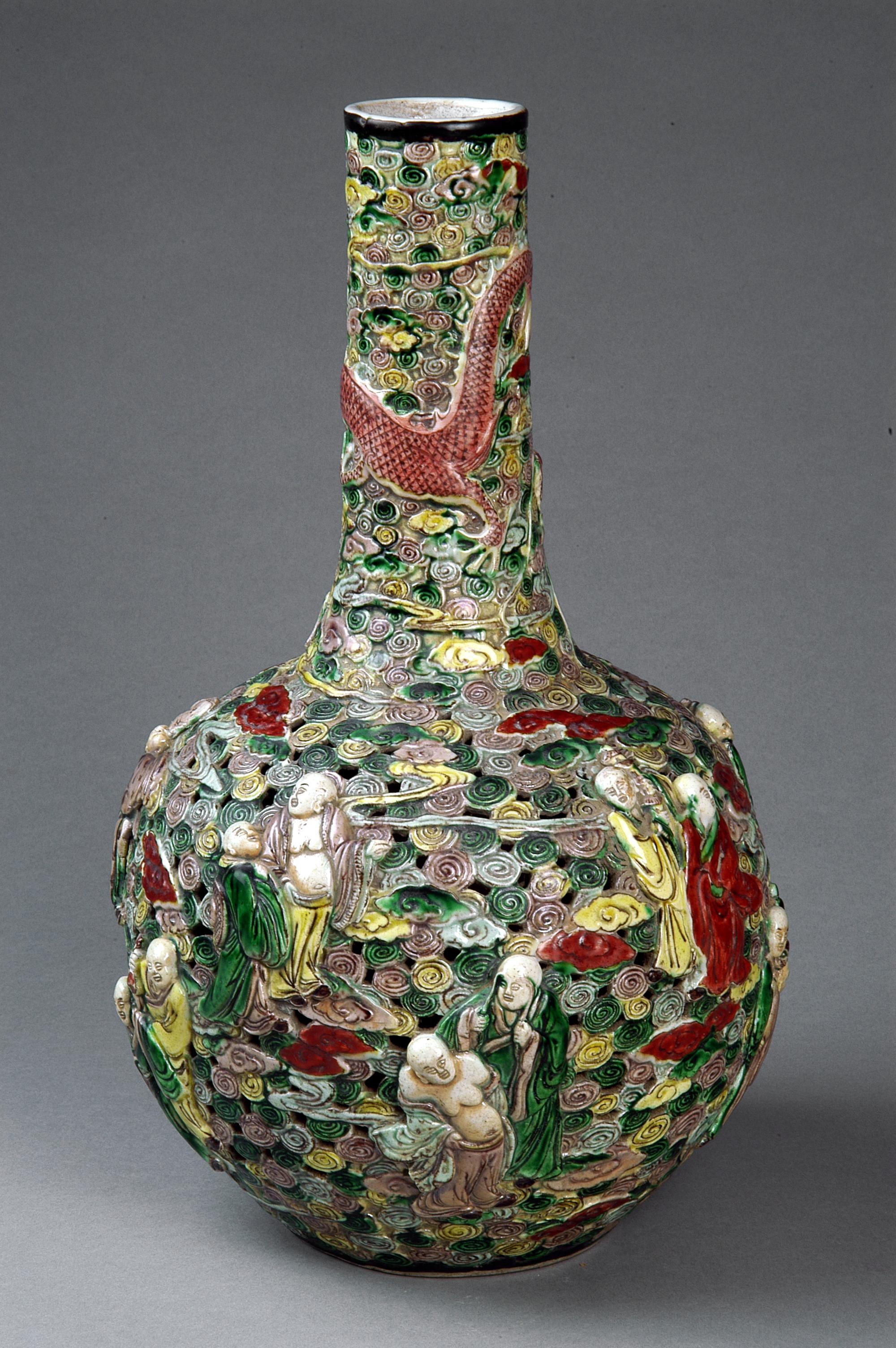 五彩透雕十八羅漢云龍瓶