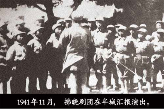 1938年深秋,劇團到泌陽縣鄧莊鋪演出,群眾自動地找木棍、找門板、挖土埋柱子,很快搭起一座戲臺,掛上幕布,點燃油燈,男女老少坐在戲臺前的空地上。戲臺上先是演員們合唱抗日歌曲《新四軍軍歌》《游擊隊歌》《到敵人后方去》等,后演出話劇《突擊》。當劇中的老爺爺抱著被日寇殺死的孩子,含淚控訴敵人的暴行時,臺下的觀眾禁不住地憤怒高呼:“打倒日本帝國主義!把日本鬼子趕出中國!”1939年11月初,徐海東隨劉少奇由竹溝到華中路過新興集,彭雪楓命拂曉劇團組織一個晚會,以示熱烈歡迎。拂曉劇團接受任務后,大家爭分奪秒,只用了一天時間,就集體創(chuàng)作排練出京劇《徐海東粉碎日寇“掃蕩”》,第二天就在歡迎晚會上演出。