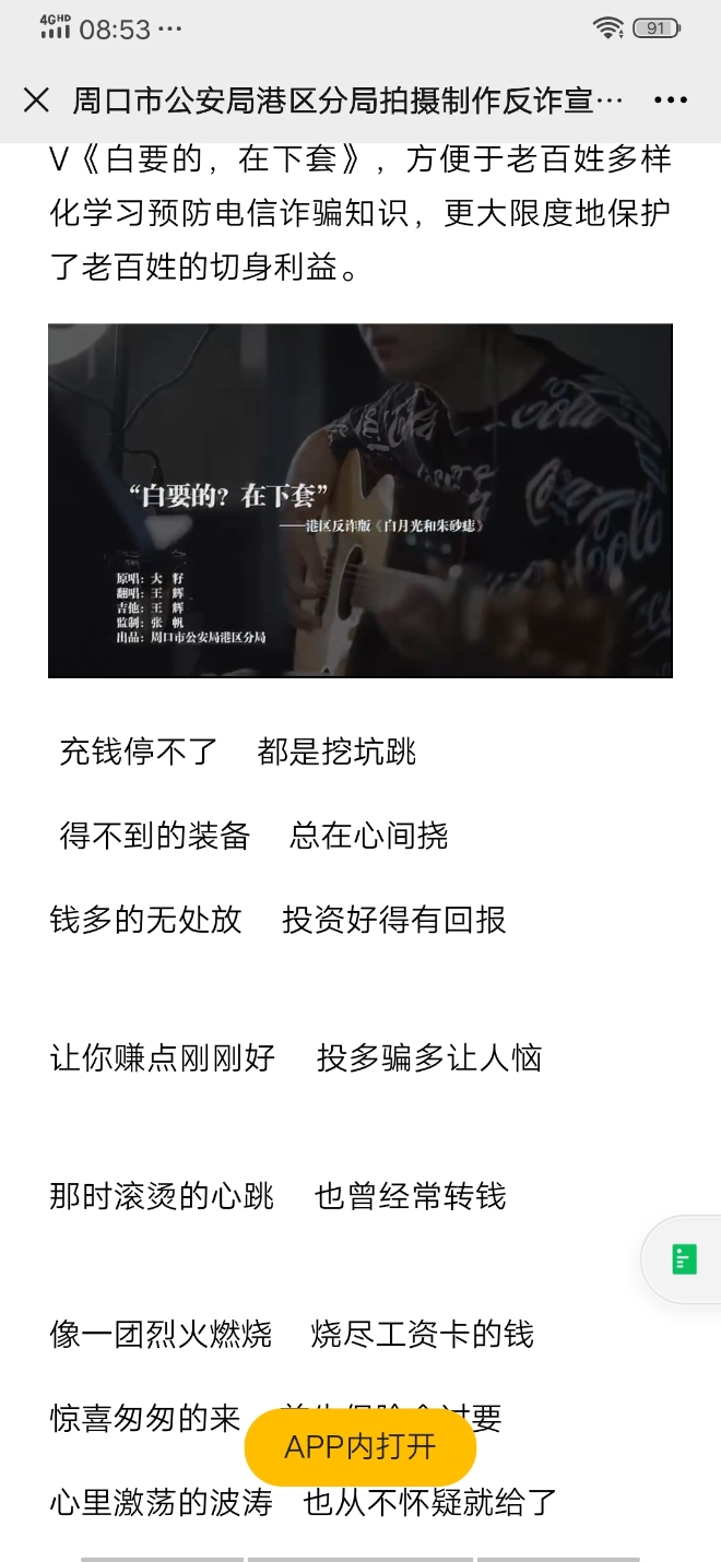 “白要的在下套,你才想起被騙了,騙術(shù)有很多樣,你是否能知道,要記住一句話,騙貪心的人容易,不輕信不轉(zhuǎn)賬,不貪便宜?!比涨?,一首由周口市公安局港區(qū)分局拍攝的反詐歌曲MV《白要的,在下套》出現(xiàn)在網(wǎng)絡(luò)上,受到市民朋友的熱捧。