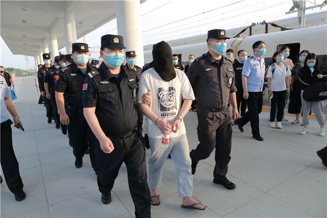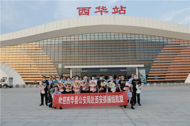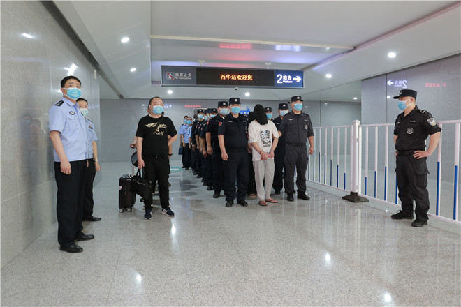 當天,西華縣公安局在鄭阜高鐵西華站舉行歡迎儀式,迎接赴西安抓捕組凱旋歸來。特警在站臺上排列整齊、嚴陣以待,列車準時停靠到站,7名犯罪嫌疑人隨即被押解下車,全副武裝的特警立即上前進行押解交接,押往在高鐵出站口等候的裝甲車上。至此,歷經(jīng)三天三夜,一起電信網(wǎng)絡詐騙團伙案成功告破。