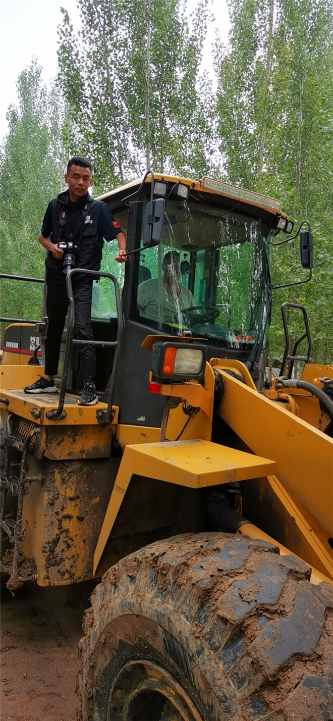 記者李龍周來到扶溝縣曹里鄉(xiāng)賈魯河擺渡口大閘附近,為找到更為合適的拍攝角度記者爬上了救災(zāi)鏟車。