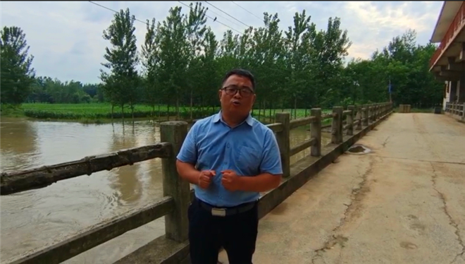 記者軒洋在扶溝縣北關(guān)大閘介紹水位情況