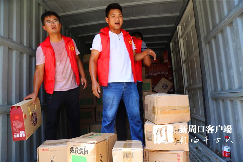 當(dāng)天中午,掛著印有“昨天大家助我脫貧,今天我為救災(zāi)出力!”條幅的防汛救災(zāi)物資運(yùn)輸車抵達(dá)周口港區(qū)?!耙皇乔皟商旆烙_(tái)風(fēng)‘煙花’,我們?cè)缇蛠?lái)了?!甭」糯妩h支部書記段長(zhǎng)春一下車就連忙慰問(wèn)眾人。一同前往的還有6位年輕力壯的志愿者,他們不辭勞苦,和港區(qū)消防、城管人員一起頂著烈日,用了半個(gè)多小時(shí)將滿車物資搬運(yùn)到位。