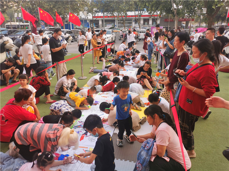 10月1日下午,在位于周口市中心城區(qū)七一路與中州大道交叉口的萬果園家庭茂商超前,近百名小朋友聚集在一起用手中的畫筆表達(dá)對(duì)祖國(guó)母親的祝福。