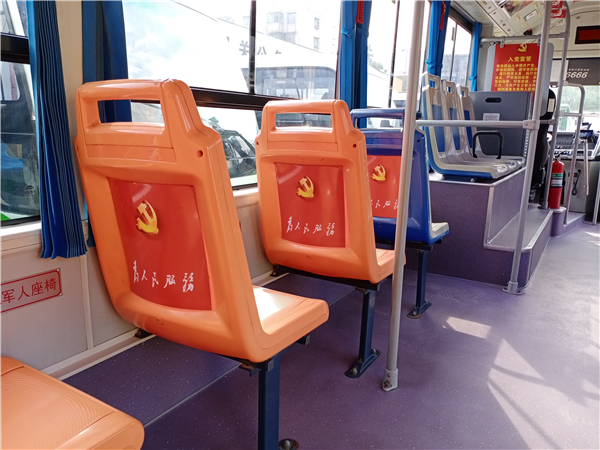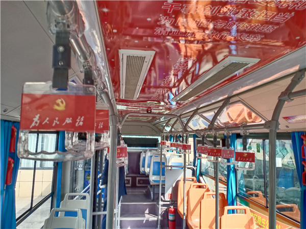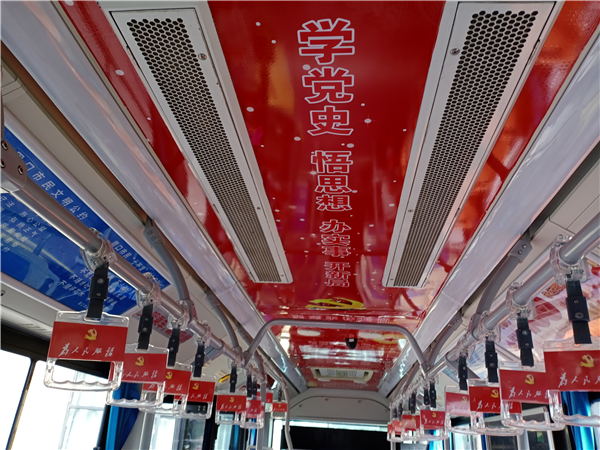 圖片說(shuō)明:10月25日,記者在周口市公交總公司院內(nèi)看到,一輛車(chē)頭前印有“紅色主題班線”標(biāo)識(shí)的公交車(chē)格外引人注目,雖然該車(chē)的外形與其他車(chē)差別不大,可是車(chē)廂內(nèi)貼滿(mǎn)了紅色標(biāo)語(yǔ)口號(hào),給人耳目一新的感覺(jué)。記者看到,車(chē)廂內(nèi)的扶手、座椅及車(chē)頂上都貼有“為人民服務(wù)”“學(xué)黨史、悟思想、辦實(shí)事、開(kāi)新局”“革命小故事”等宣傳內(nèi)容。③2