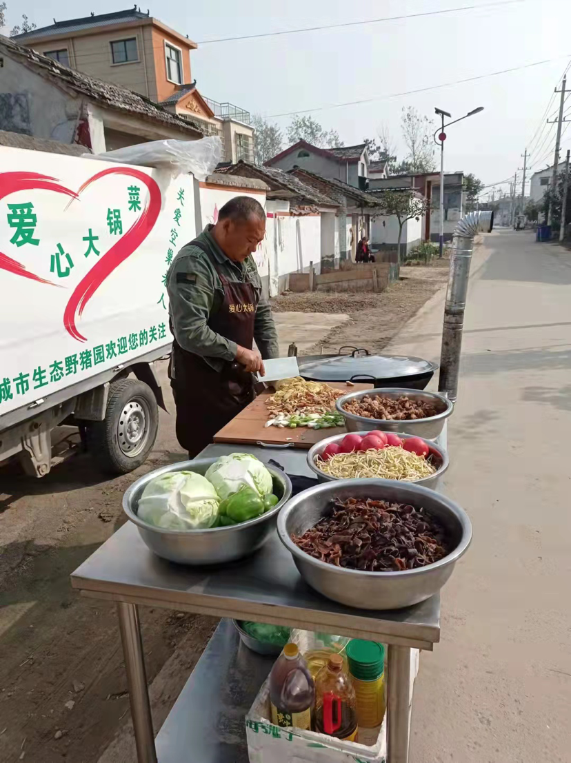 韓洪偉,項(xiàng)城市王明口鎮(zhèn)人,今年45歲,他和妻子經(jīng)營一家黑豬養(yǎng)殖場,他就是愛心大鍋菜的掌勺師傅?!爱?dāng)神州大地被突如其來的新冠肺炎疫情肆虐時(shí),我就想去獻(xiàn)愛心,就想給奮戰(zhàn)在一線的人做大鍋菜,但是由于疫情封控等種種原因,一直沒能實(shí)現(xiàn)?!表n洪偉說。今年農(nóng)歷八月十六這一天,韓洪偉和表弟田恒昌、嫂子田紅梅一起組成了愛心大鍋菜小分隊(duì),在親朋好友的的支持下開始了他們的“愛心事業(yè)”。據(jù)韓洪偉介紹,田恒昌斥資2萬多元購買一輛二手廂式貨車,并花了1000多元購買了鍋灶和不銹鋼案板,韓洪偉每天拿出自家養(yǎng)的黑豬肉三四十斤,田紅梅則打下手做飯,捎帶著平時(shí)買個(gè)油鹽醬醋……