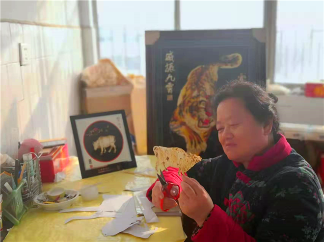 “虎在中國是極其有力量的動物?!?月25日,秸稈畫技藝代表性傳承人、中國民間文藝家協(xié)會國家級會員王春梅告訴記者,她耗時近半年創(chuàng)作的秸稈畫《威震九霄》已完成。記者看到,作品中的老虎長半米有余,威風凜凜、活靈活現(xiàn),用平面的方式展現(xiàn)了立體的效果?!?022年是虎年。在古代,老虎就以威風凜凜的形象被視為勇氣的象征,來表現(xiàn)軍人的勇敢和堅強。古時候關于將士大臣的美譽就有虎將、虎臣、虎士等。”王春梅說。