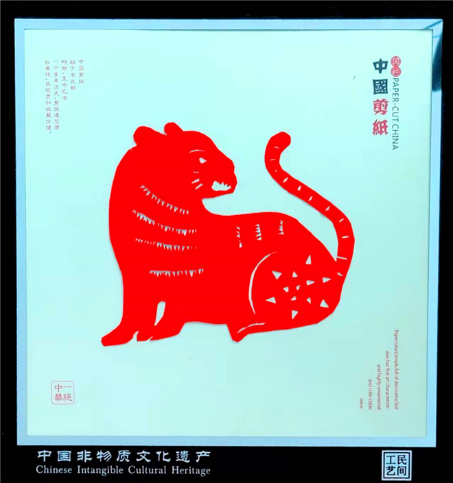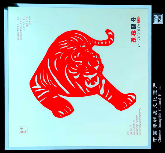 為了慶?;⒛?,王春梅創(chuàng)作的秸稈畫主要有《威震九霄》《虎之王者》《飛天神虎》等,此外,她還創(chuàng)作了兩幅剪紙作品,分別是《虎年組圖》和《虎之2022》。和剪紙作品相比,秸稈畫制作工序更加復雜,全憑手工完成,充分利用秸稈本身的紋理和質(zhì)地,結合顏色、溫度的變化,將畫面立體的呈現(xiàn)出來。其中,她創(chuàng)作的部分作品結合了唐卡的相關風格和顏色配比,比如《威震九霄》中虎的形象所表現(xiàn)出來的力量感借鑒了唐卡中護法的力量感;《虎之王者》和《虎之2022》中對于藍色的運用結合了唐卡中的藍色,代表了永恒不變,如同穹蒼攬護萬物之意。