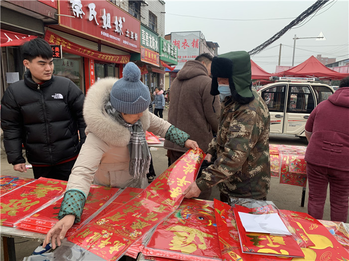 春節(jié)將至,不斷映入眼簾的喜慶“?!弊钟骋r著摩肩接踵的人群。趕集時,家家都要買幾張年畫、幾副春聯(lián),今年,以“虎”為主題的年畫春聯(lián)自然成了主角?!斑@個虎頭年畫今天已經(jīng)脫銷了,這個‘年年有余’的也喜慶?!睌傊魍醮蠼阋贿厧皖櫩吞裟戤嬕贿呅χf。年前,她早早囤好了近百種樣式的老虎年畫,現(xiàn)在看來還是不夠賣。除了過年必備的年畫春聯(lián),她還準備了紅燈籠、紅燭等,也十分暢銷。