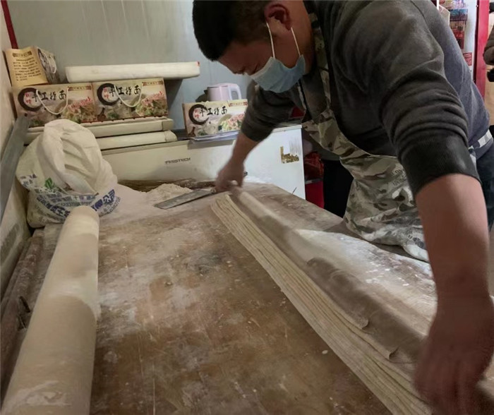 此時,固墻鎮(zhèn)集市最低溫度為零攝氏度,40歲的王永強卻汗流浹背。他,正在自家面館里忙得熱火朝天。從14歲起,王永強就跟著表哥學習做手搟面,到現(xiàn)在已有26年的制作經(jīng)驗?!斑^年這段時間一天搟10小時以上,能出個七八百碗,就這都賣不及?!蓖跤缽娺呎f邊做準備工作,只見他將一盆醒好的、重40斤,用高筋面粉和鹽和好的面團鋪在案板上,拿出一根一米五長的鐵棍將面團按壓平整,再用有十幾年歷史的搟面杖,邊鋪撒玉米淀粉、邊用力搟。1個小時后,面團被搟至薄皮狀,最后按層折疊鋪好,用快刀切成相等寬度,撣走多余面粉,挽成麻花狀。如此,遇水不散、出水不沾、溫潤光滑、筋而不膩的固墻手搟面就完成了。固墻手搟面最常見的做法是用大火多水煮沸后,撈起配以番茄雞蛋、蒜泥黃瓜,拌勻后享用。夾起一筷子面條,觀其形如玉帶臨風,察其色若飛雪粼粼,送入口中品其味,則似玉蘭入口,真是美哉!爽哉!