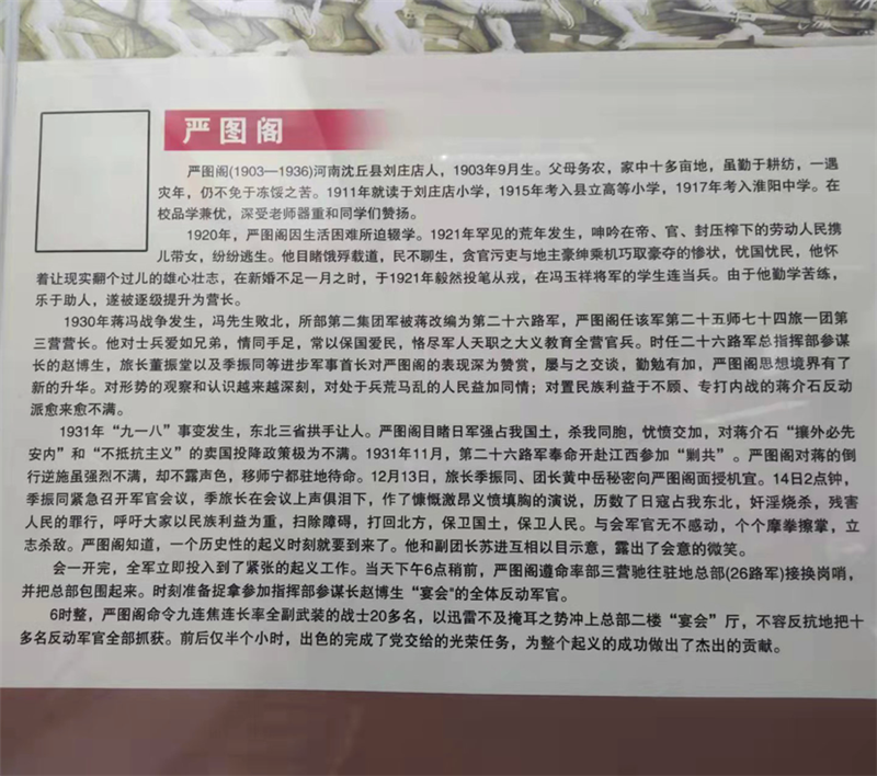 嚴圖閣出生于1903年,河南省沈丘縣人。1911年,嚴圖閣被父親送進劉莊店小學(xué)讀書,1915年考入縣立高等小學(xué),1917年投考淮陽中學(xué)被錄取。他刻苦讀書,成績優(yōu)異,深得老師和同學(xué)們的贊揚。1921年,他毅然背井離鄉(xiāng),外出從軍。1930年,嚴圖閣任國民革命軍第二十六路軍一團三營營長。1931年12月,參加著名的寧都起義,成為中國共產(chǎn)黨領(lǐng)導(dǎo)的革命隊伍中的一員。寧都起義后,嚴圖閣所在部隊改編為紅軍第五軍團,由于其驍勇善戰(zhàn),累積戰(zhàn)功,被任命為第十六師參謀長。1932年,嚴圖閣正式加入中國共產(chǎn)黨。1935年在湖北一場戰(zhàn)斗中身負重傷,后轉(zhuǎn)移至湖南省平江縣治療。1936年3月,嚴圖閣奉命擔(dān)任湘鄂贛省軍區(qū)司令員職務(wù),進行游擊戰(zhàn)爭,為保衛(wèi)湘鄂贛革命根據(jù)地作出了貢獻。1936年11月,嚴圖閣因病不幸去世。