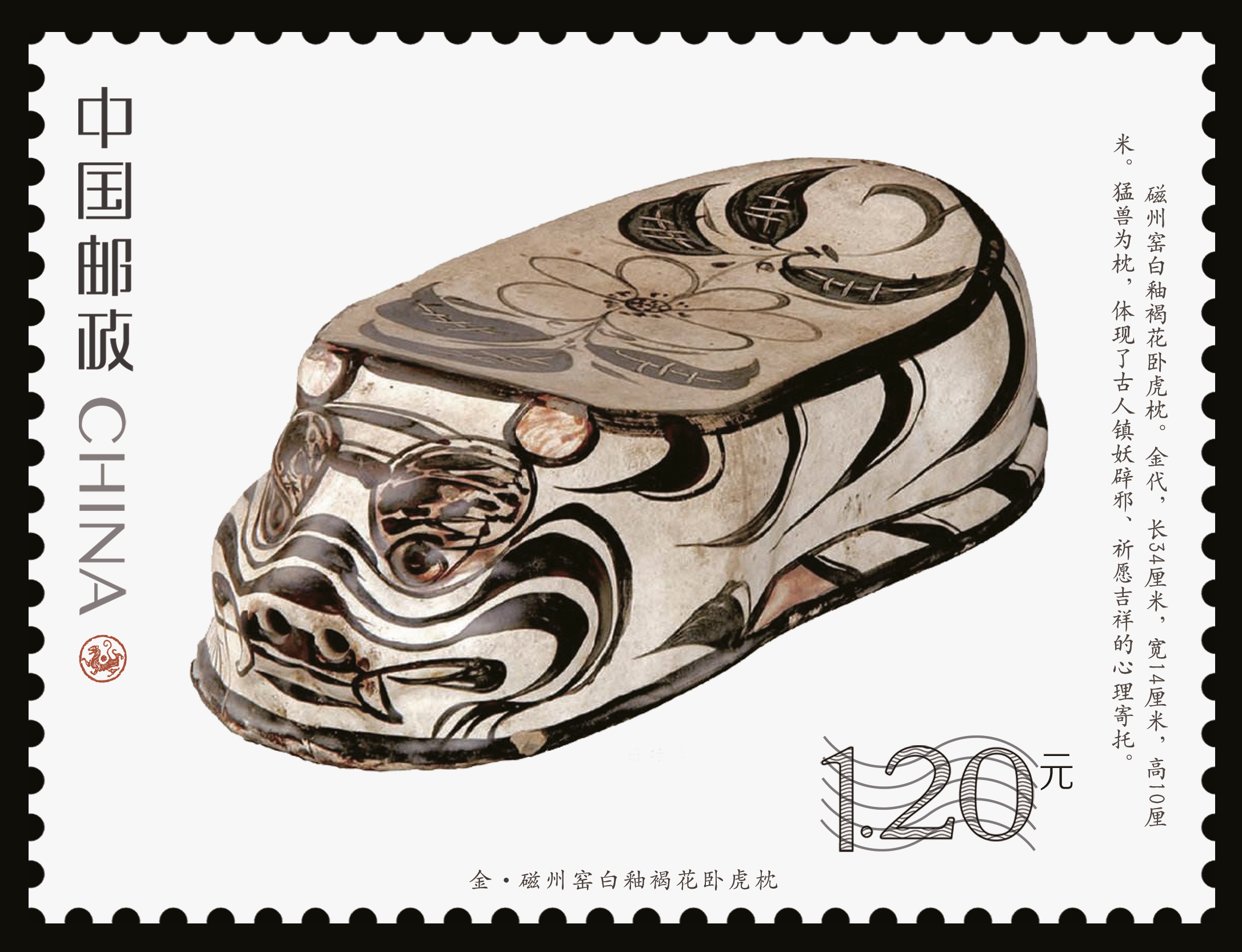 9月5日,由中國郵政特別制作的《虎文物》特種郵票正式發(fā)行。此套郵票共有6枚,每枚上都印有一件珍貴的虎文物。郵票圖案名稱分別為“商·伏鳥雙尾青銅虎”“春秋·青玉虎形佩”“漢·白虎瓦當(dāng)”“漢·錯金銘文銅虎節(jié)”“金·磁州窯白釉褐花臥虎枕”“清·皮影飛虎”。其中第五枚郵票圖案中的“金·磁州窯白釉褐花臥虎枕”就是來自周口市博物館的珍貴文物。
