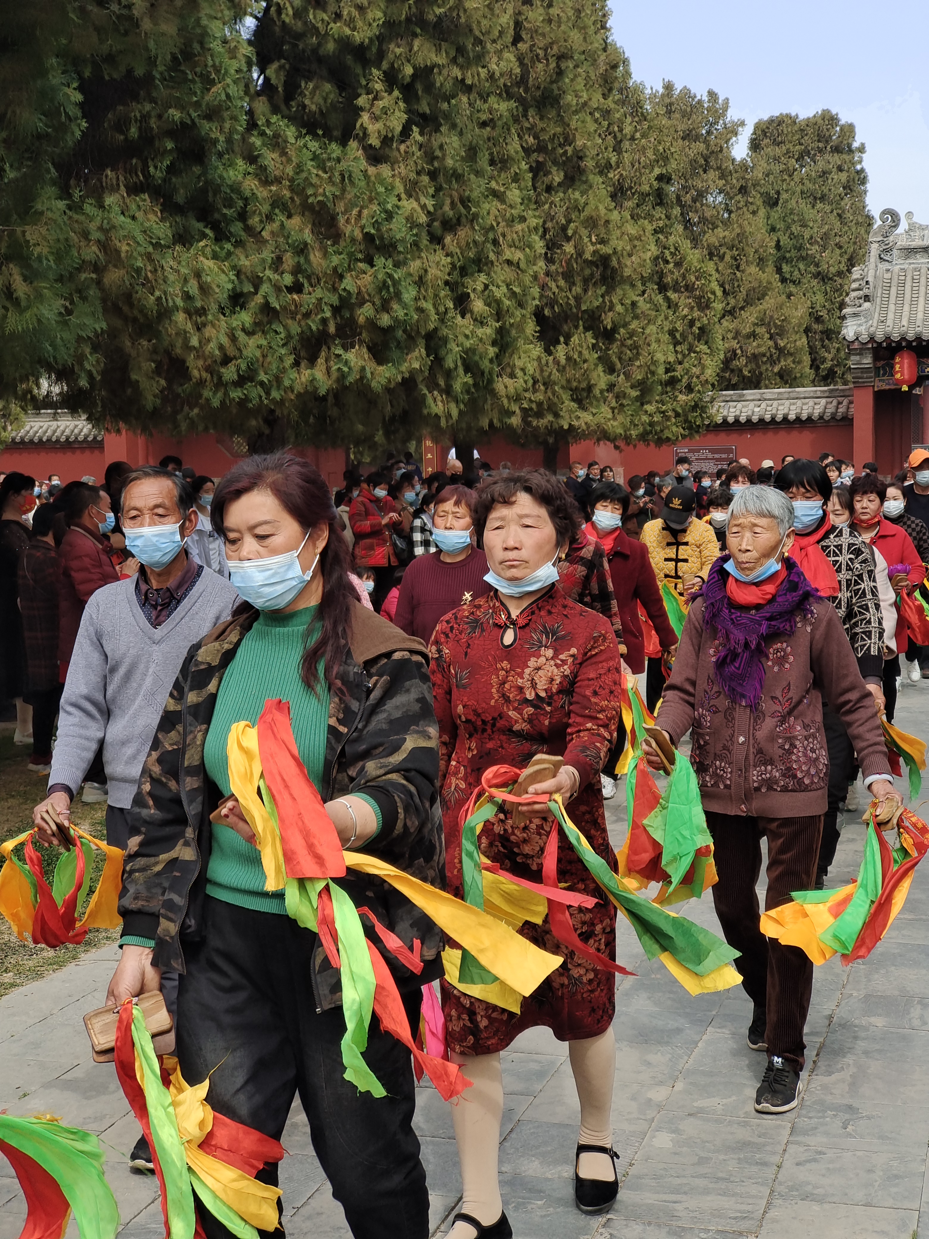 在疫情防控背景下,太昊陵中的子孫窯和岳飛觀暫時關(guān)閉。人們路過“子孫窯”時,會不自覺摸摸墻角;路過岳飛觀時,會雙手合十,帶孩子的會講岳飛的故事。變化之中,一些不變的照常進行:往碑刻上貼硬幣,祈求好運;站在千年耳柏前,向人祖伏羲低聲訴說著心事;繞伏羲大墓一周,添一把土……在淮陽區(qū)各職能部門的努力下,這一古老又現(xiàn)代的盛會平穩(wěn)又精彩地運行著。②5