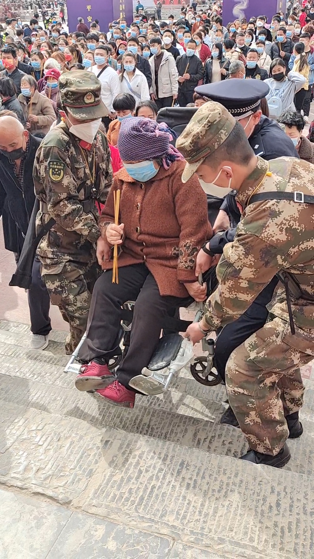 只要看到有腿腳不便的人上臺階不方便,附近的人民子弟兵立刻快步上前,扶上臺階。一位坐輪椅的老太太進不去午朝門,3位武警官兵、一名警察以及熱心群眾齊心協(xié)力抬起輪椅,穩(wěn)穩(wěn)地把老太太抬進門里。不等被幫助的人說聲“謝謝”,這些子弟兵就快速回到崗位,有人說他們戴著口罩看不到模樣,想知道他們的名字,他們說:“名字不重要,為人民服務(wù)最重要!”