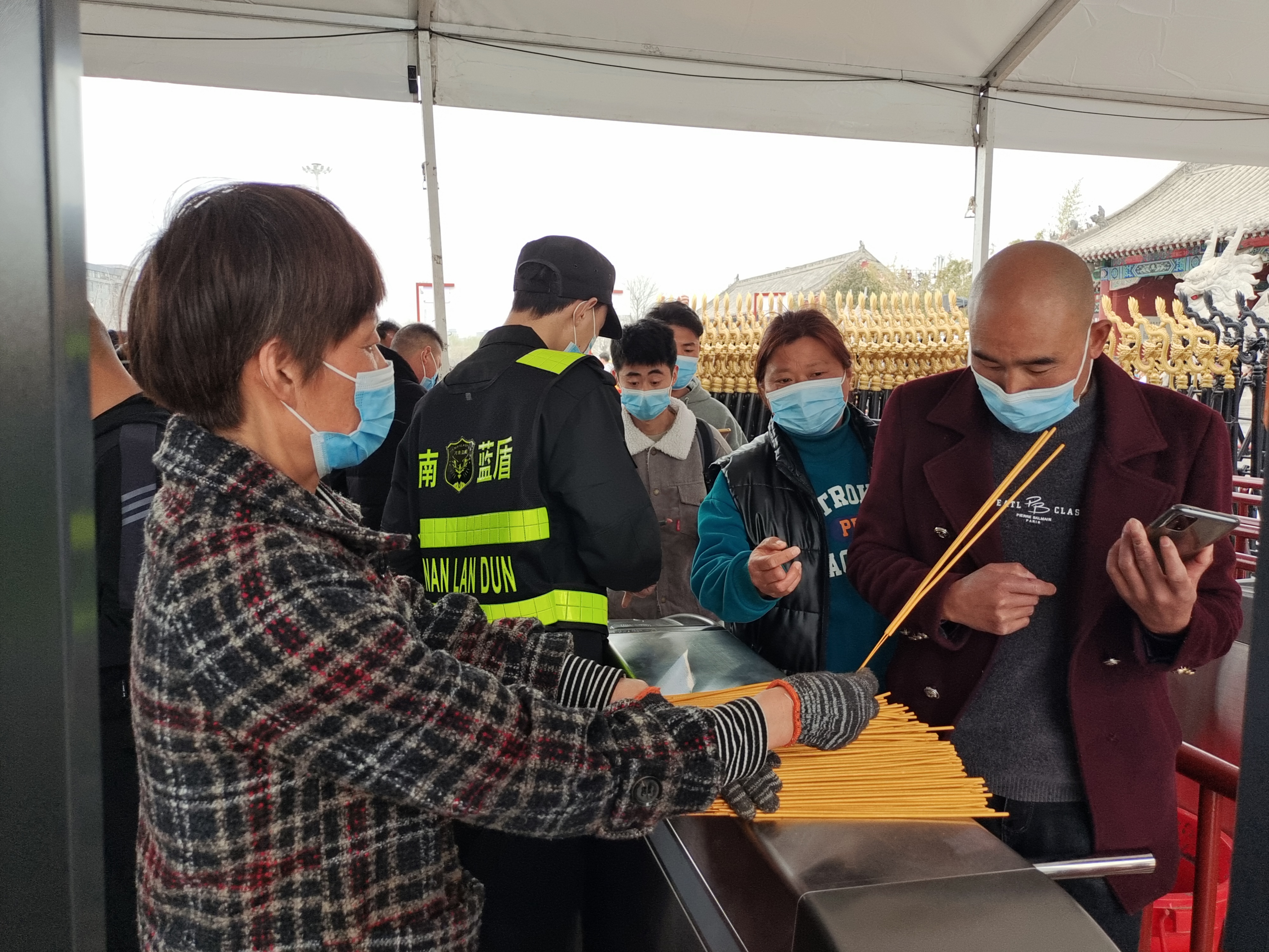 “這是您的祈福香,請拿好?!碧涣甑拿總€入口,既有專人檢查私自帶香行為,也有工作人員為游客免費發(fā)放線香。家住淮陽區(qū)的李姐是其中一員,她早上5時30分就到達景區(qū),領(lǐng)取線香并整理,方便為游客發(fā)放?!爸灰€有游客來,我們就不休息,要把祈福的心愿送到他們手中,并引導(dǎo)他們文明燒香、文明祭祀?!崩罱阏f。