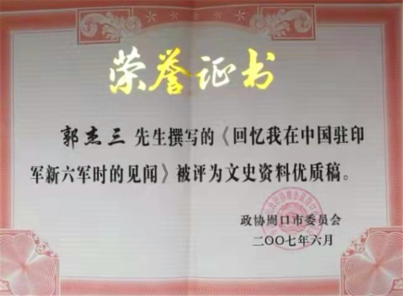 2005年9月3日,時任中共中央總書記、國家主席、中央軍委主席胡錦濤發(fā)表了《在紀(jì)念中國人民抗日戰(zhàn)爭暨世界反法西斯戰(zhàn)爭勝利60周年大會上的講話》,正視了正面戰(zhàn)場國民黨軍隊(duì)抗戰(zhàn)的歷史。之后,父親才給我講述他遠(yuǎn)征抗日的經(jīng)歷,并撰寫了《回憶我在中國駐印軍新六軍時的見聞》一稿,刊登在2007年《周口文史資料》上。政協(xié)為表彰父親的貢獻(xiàn),特別頒發(fā)了“文史資料優(yōu)質(zhì)稿”獎狀。