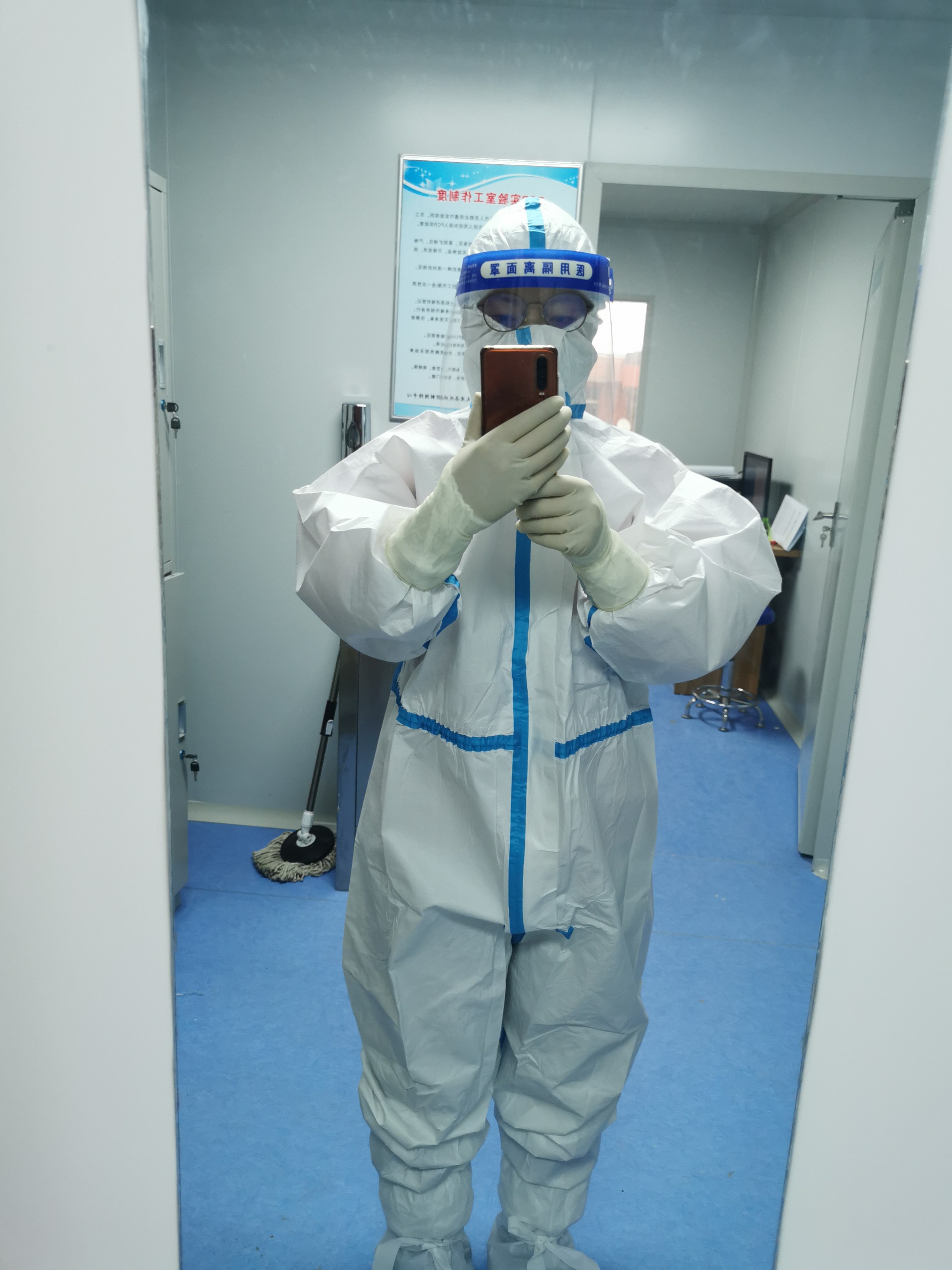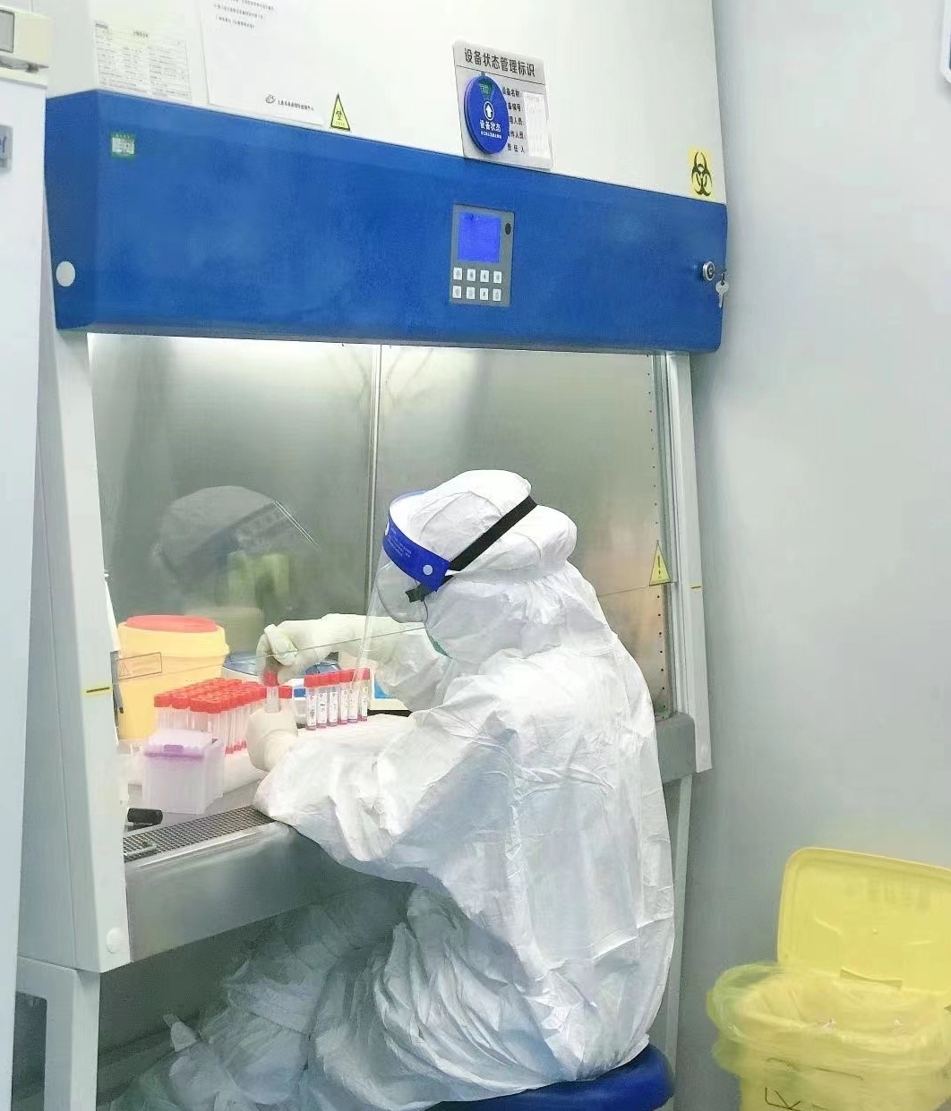 實(shí)驗(yàn)室的三級(jí)防護(hù)包括穿著連體防護(hù)服,戴N95口罩、雙層手套、鞋套和護(hù)目鏡。由于核酸檢測(cè)不同于其他檢測(cè),PCR 實(shí)驗(yàn)室里機(jī)器不間斷運(yùn)行,即使開(kāi)著空調(diào),室內(nèi)溫度也有27℃~28℃。密不透風(fēng)的防護(hù)裝備一穿就是6個(gè)小時(shí)~8個(gè)小時(shí),感染風(fēng)險(xiǎn)大、操作過(guò)程長(zhǎng),每次結(jié)束工作,姜等等渾身都會(huì)被汗水浸透。核酸提取、體系配制、擴(kuò)增檢測(cè)……每道程序背后,都充滿(mǎn)了高風(fēng)險(xiǎn)。接收的樣本有鼻咽拭子,鼻咽拭子直接震蕩混勻處理,取一定量到核酸提取板,提取完成,加一定量提取液到透明的八聯(lián)管內(nèi),每一步都要做到無(wú)一缺漏。