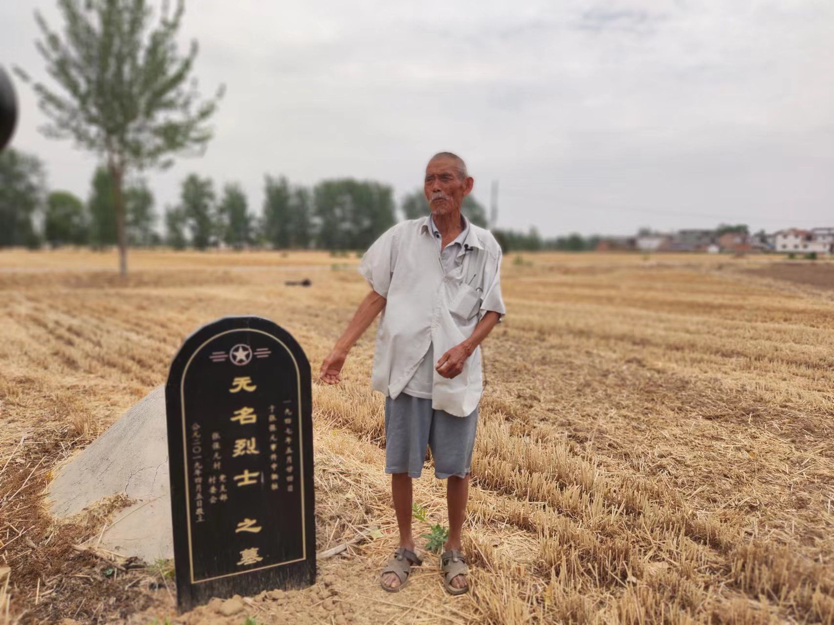 在87歲老人張金堯帶領(lǐng)下,記者一行來到了這位“小八路”的墳地。墳地位于緊鄰張保園的小郭莊行政村的莊稼地里。長眠于此的這位“小八路”,墓碑上沒有遺像,沒有生平記載,僅有“一九四七年五月廿四日(陰歷)張保園事件中犧牲”“無名烈士之墓”就是他的全部。