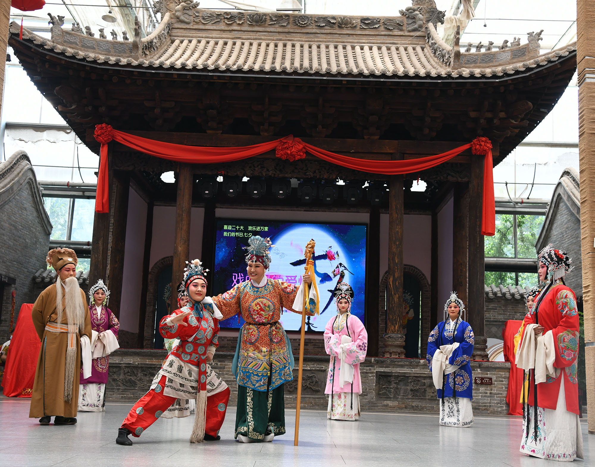 ?8月3日上午,市豫劇團團長、戲劇藝術(shù)家肖秀蓮帶領(lǐng)演員們在建業(yè)大食堂演出《五世請纓》中的《一家人歡天喜地》一折。