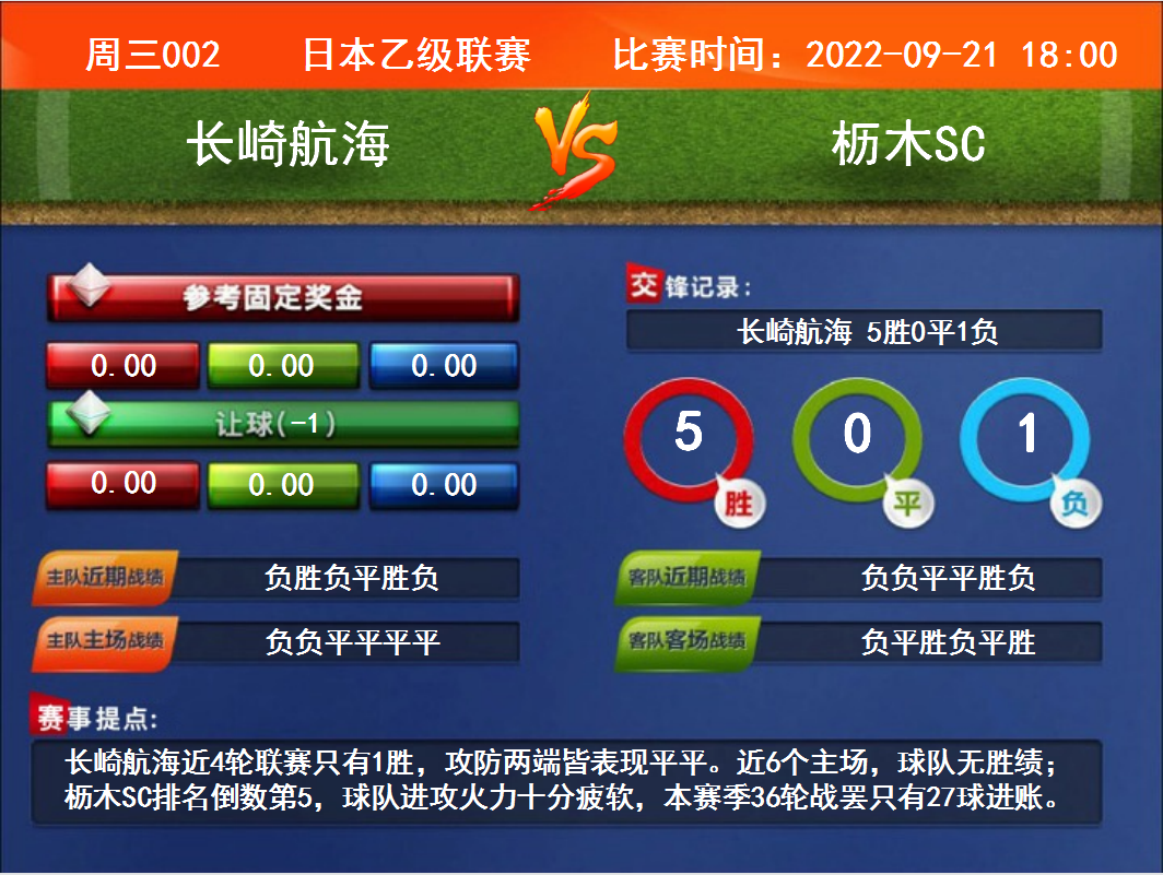 周三002 日本乙級(jí)聯(lián)賽 長崎航海VS櫪木SC