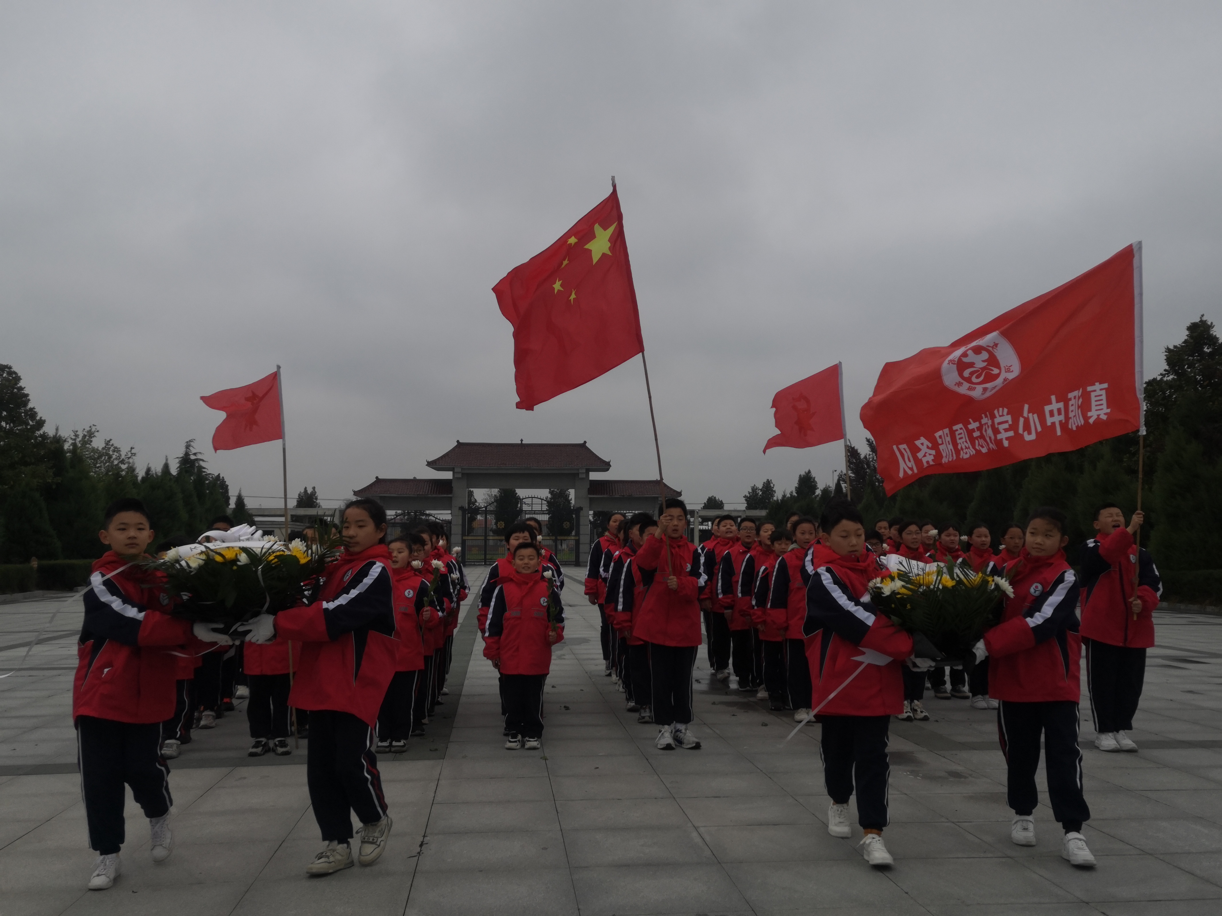 隨后,少先隊員代表獻詞,表明不辜負國家、社會重托,奮勇向前,頑強拼搏的志向。全體少先隊員莊嚴宣誓,師生們共同瞻仰紀念碑,祭掃陵園,敬獻鮮花。
