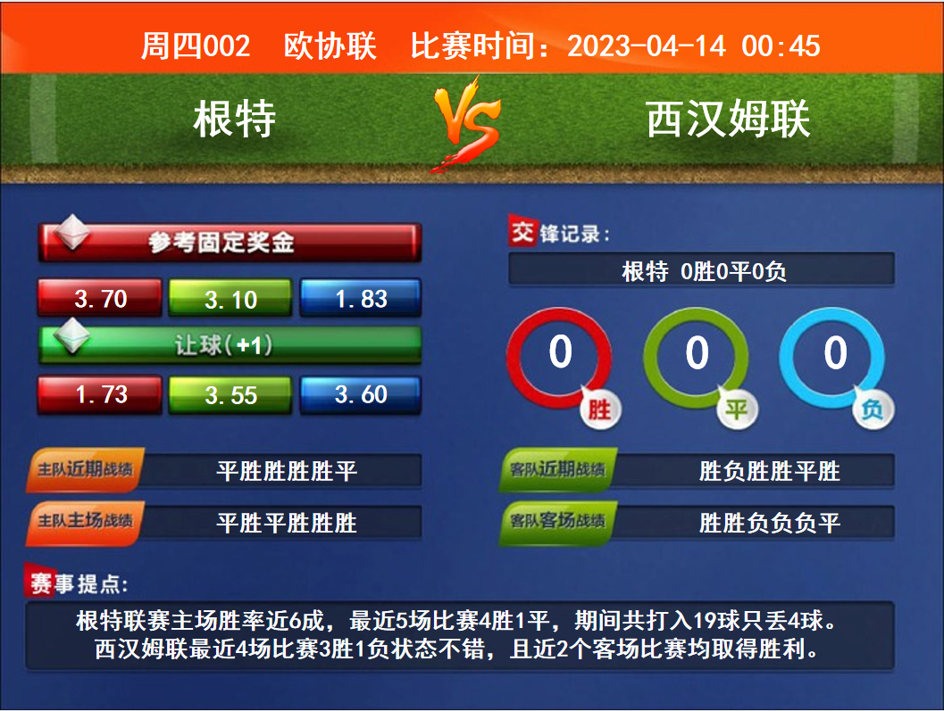 比賽時間:2023-04-14 00:45賽事提點:根特聯賽主場勝率近6成,最近5場比賽4勝1平,期間共打入19球只丟4球。西漢姆聯最近4場比賽3勝1負狀態(tài)不錯,且近2個客場比賽均取得勝利。