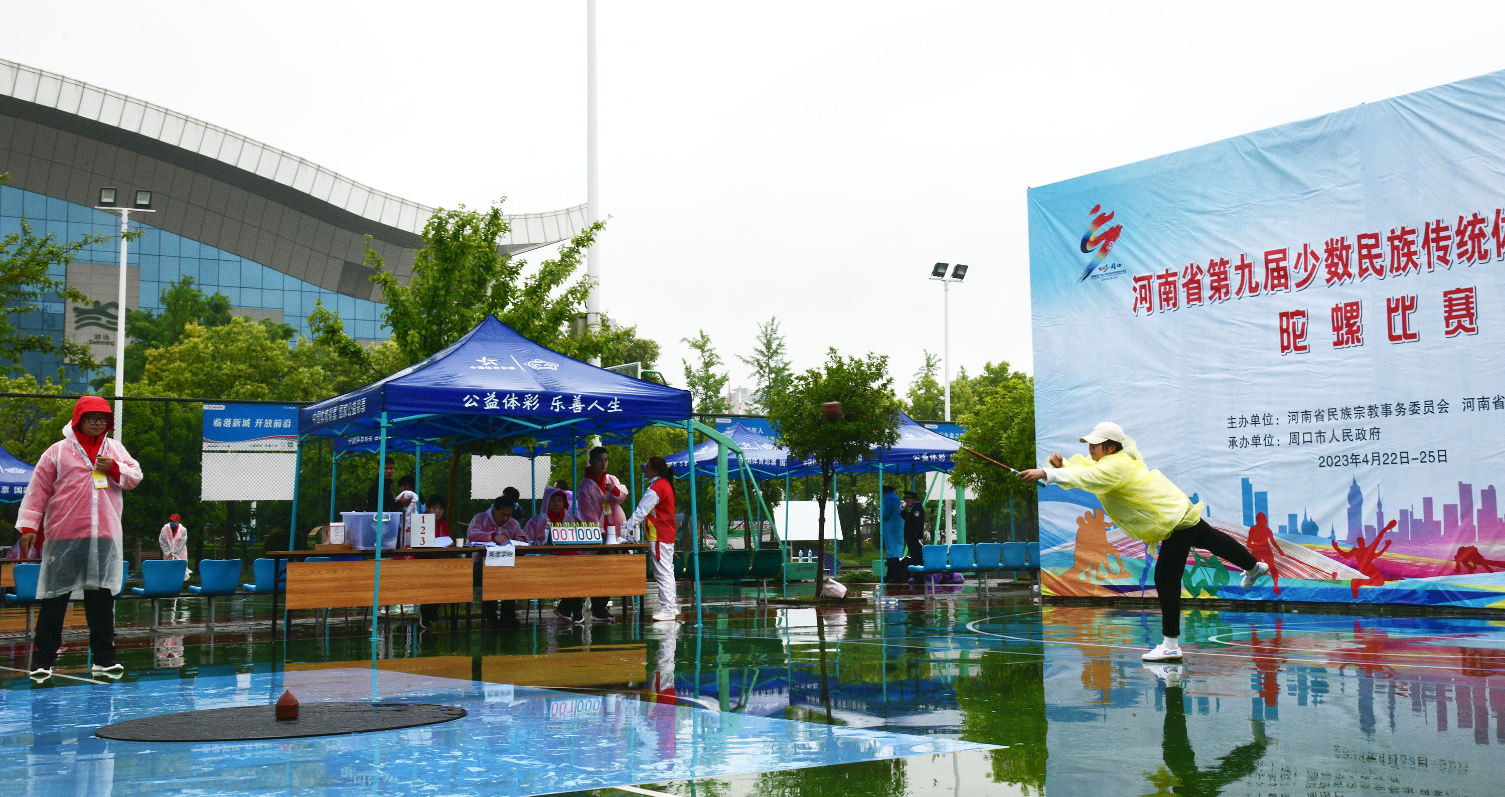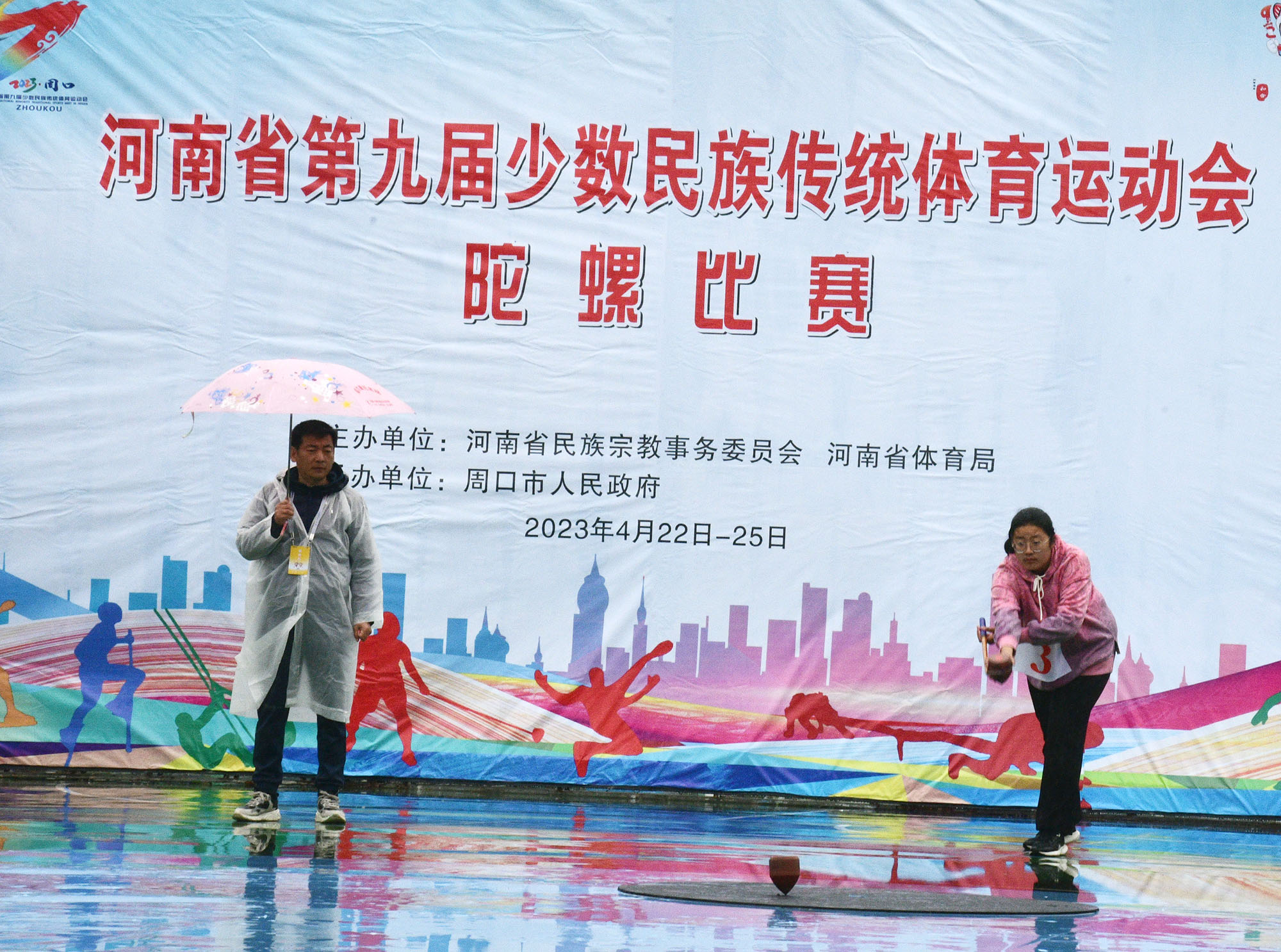 4月23日上午,河南省第九屆少數(shù)民族傳統(tǒng)體育運動會開賽。圖為在市體育中心進行的板鞋競速和陀螺比賽。記者 梁照曾 攝