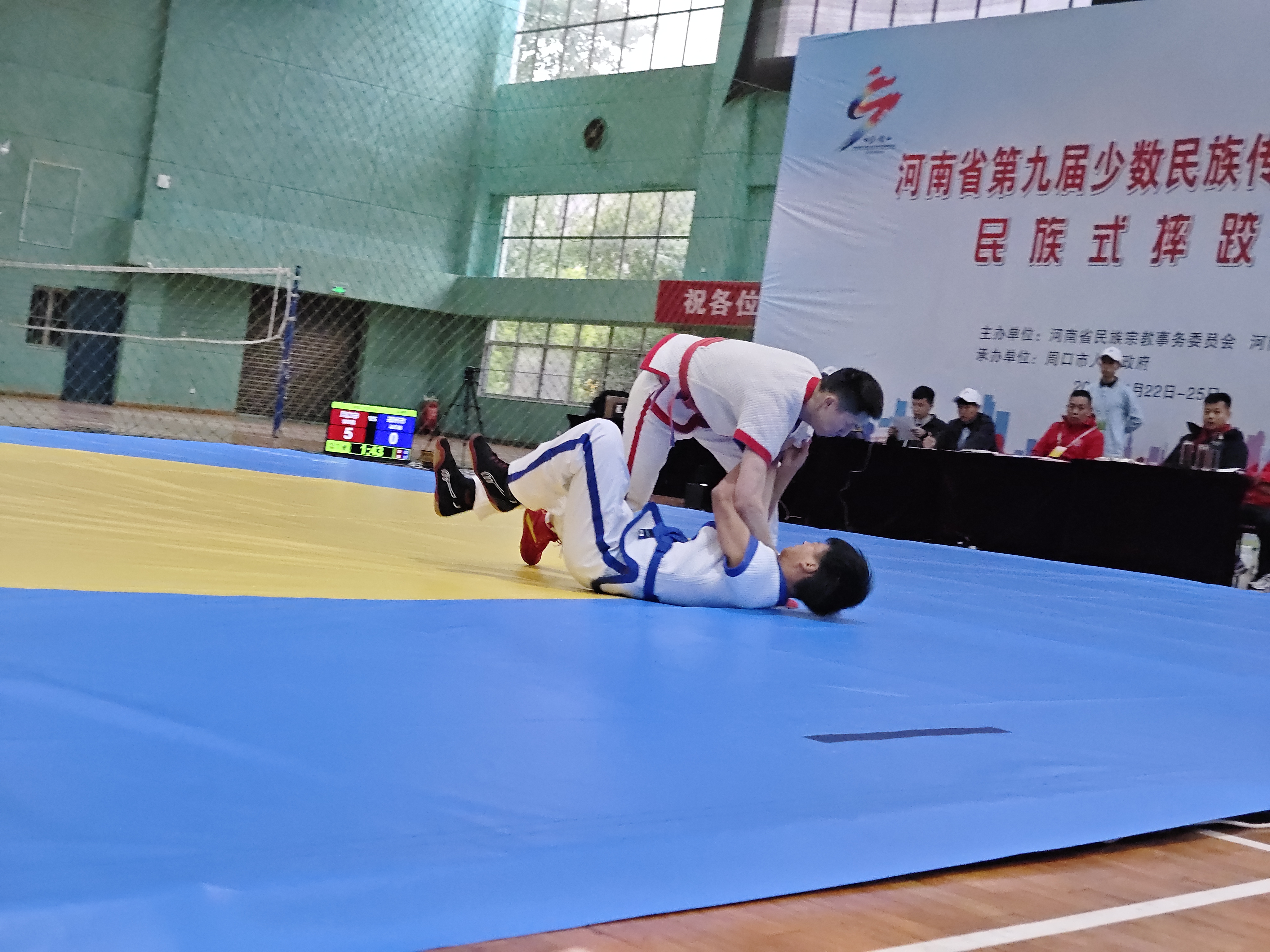 當(dāng)日,河南省第九屆少數(shù)民族傳統(tǒng)體育運(yùn)動(dòng)會(huì)民族式摔跤競(jìng)賽項(xiàng)目在周口師范學(xué)院老體育館開賽。絆跤是首個(gè)登場(chǎng)的跤種,9支代表隊(duì)參賽。該跤種以體重級(jí)別分組進(jìn)行雙敗淘汰賽,共有52kg、62kg、74kg、87kg和87kg以上等5個(gè)公斤級(jí),對(duì)應(yīng)5個(gè)一等獎(jiǎng)。經(jīng)過(guò)激烈角逐,來(lái)自漯河市、周口市和河南大學(xué)代表隊(duì)的5名選手獲得一等獎(jiǎng),我市選手李祥楷、劉小濤分別獲62kg、87kg一等獎(jiǎng)。