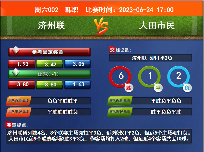 比賽時(shí)間:2023-06-24 17:00賽事提點(diǎn):濟(jì)州聯(lián)暫列第4名,8個(gè)聯(lián)賽主場3勝2平3負(fù),近3輪僅1平2負(fù),但近5個(gè)主場4勝1負(fù)。大田市民前9個(gè)聯(lián)賽客場3勝3平3負(fù),作客場均打入2球,但最近4個(gè)客場共丟10球。