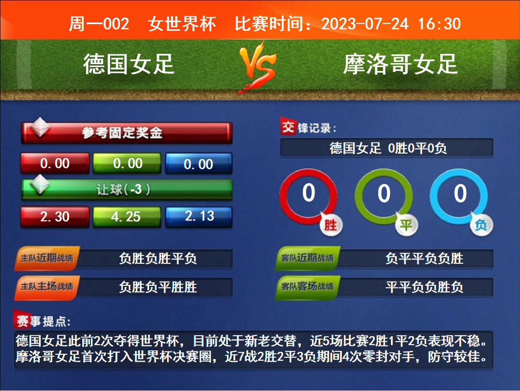 比賽時間:2023-07-24 16:30賽事提點:德國女足此前2次奪得世界杯,目前處于新老交替,近5場比賽2勝1平2負表現(xiàn)不穩(wěn)。摩洛哥女足首次打入世界杯決賽圈,近7戰(zhàn)2勝2平3負期間4次零封對手,防守較佳。