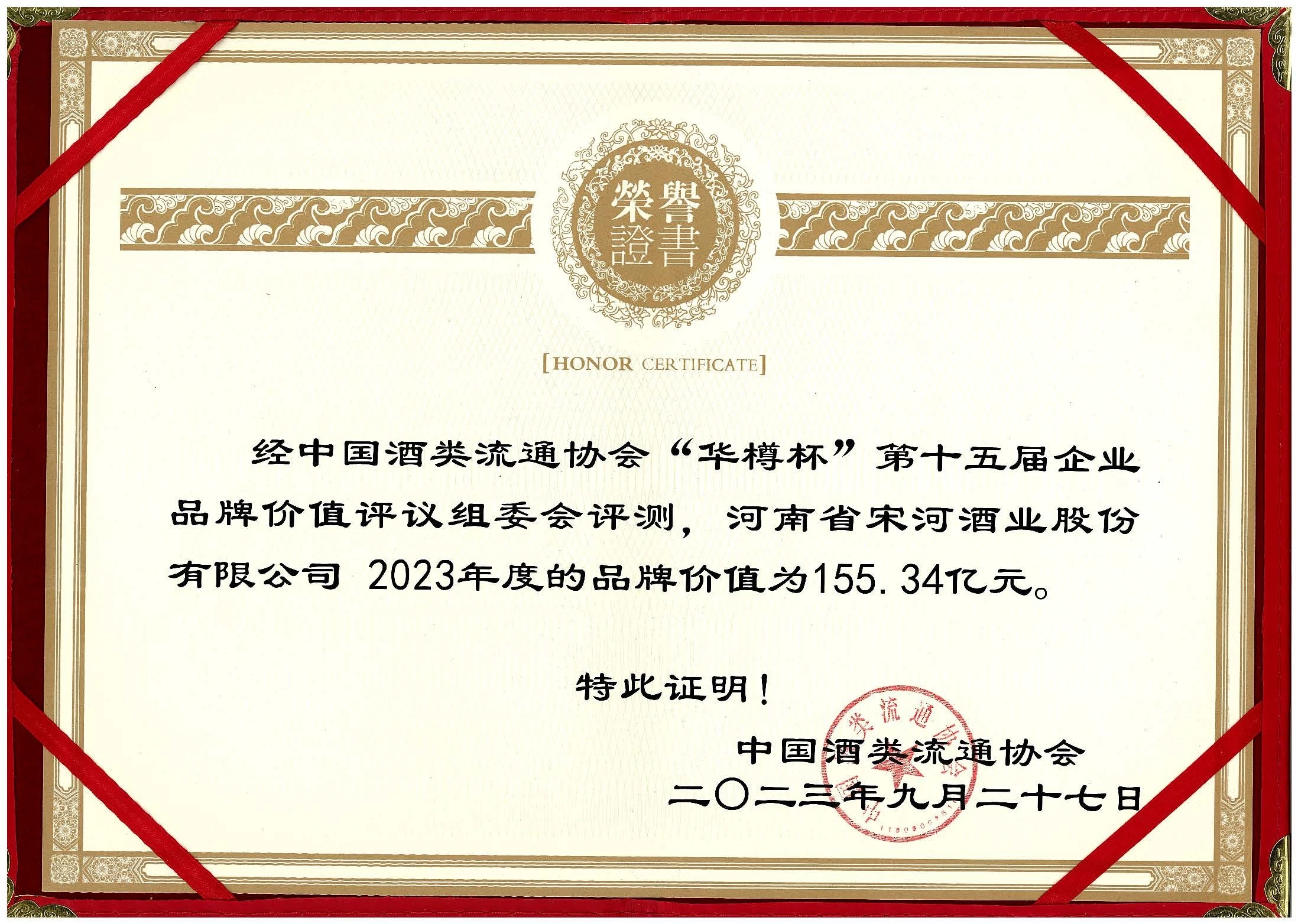 9月27日,第十五屆中國酒類企業(yè)品牌價(jià)值發(fā)布會在北京國家會議中心隆重舉辦。經(jīng)企業(yè)品牌價(jià)值評議委員會評測,宋河酒業(yè)2023年度的品牌價(jià)值為155.34億元。作為河南唯一的濃香型中國名酒品牌,宋河酒業(yè)同時(shí)在會上斬獲多項(xiàng)殊榮。