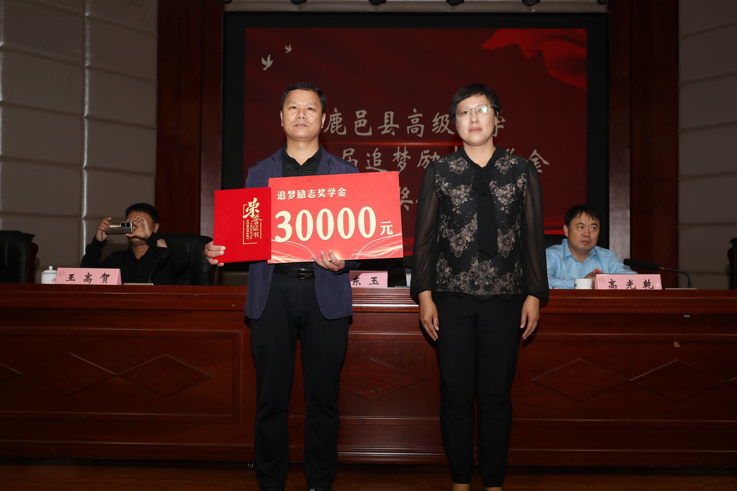 9月28日,鹿邑縣高級中學(xué)第二屆追夢勵志獎學(xué)金頒獎儀式在學(xué)術(shù)報告廳舉行??h教體局黨組書記、局長何東玉,學(xué)校黨總支書記高光乾,優(yōu)秀校友王高賀、張殿朋、耿文清、李偉杰及部分師生代表參加頒獎儀式。副校長王巖峰主持頒獎儀式。