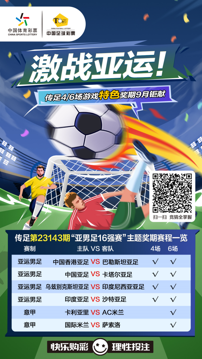 杭州亞運(yùn)會男足16強(qiáng)出爐,傳足4/6場游戲第23143期競猜對象為4場亞運(yùn)男足1/8決賽賽事和2場意甲賽事,分別為中國香港亞足VS巴勒斯坦亞足、中國亞足VS卡塔爾亞足、烏茲別克斯坦亞足VS印度尼西亞亞足、印度亞足VS沙特亞足、卡利亞里VSAC米蘭和國際米蘭VS薩索洛。
