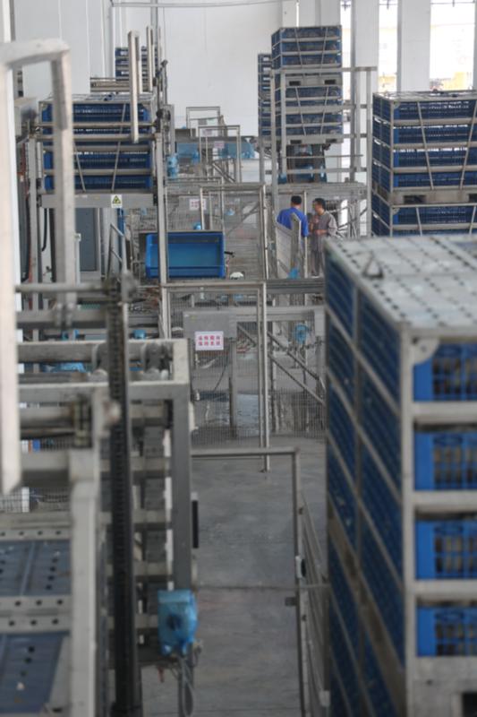 宰雞第一步先消毒,一筐筐自動(dòng)分好的白羽活雞上架后即得到?jīng)_洗,“干干凈凈”地進(jìn)入下一程序——掛雞。步驟與步驟銜接中的自動(dòng)化程度很高,掛雞室光線略暗?!拔覀儾捎脟?guó)際化標(biāo)準(zhǔn),宰殺環(huán)節(jié)在暗室進(jìn)行?!毕嚓P(guān)人員說。