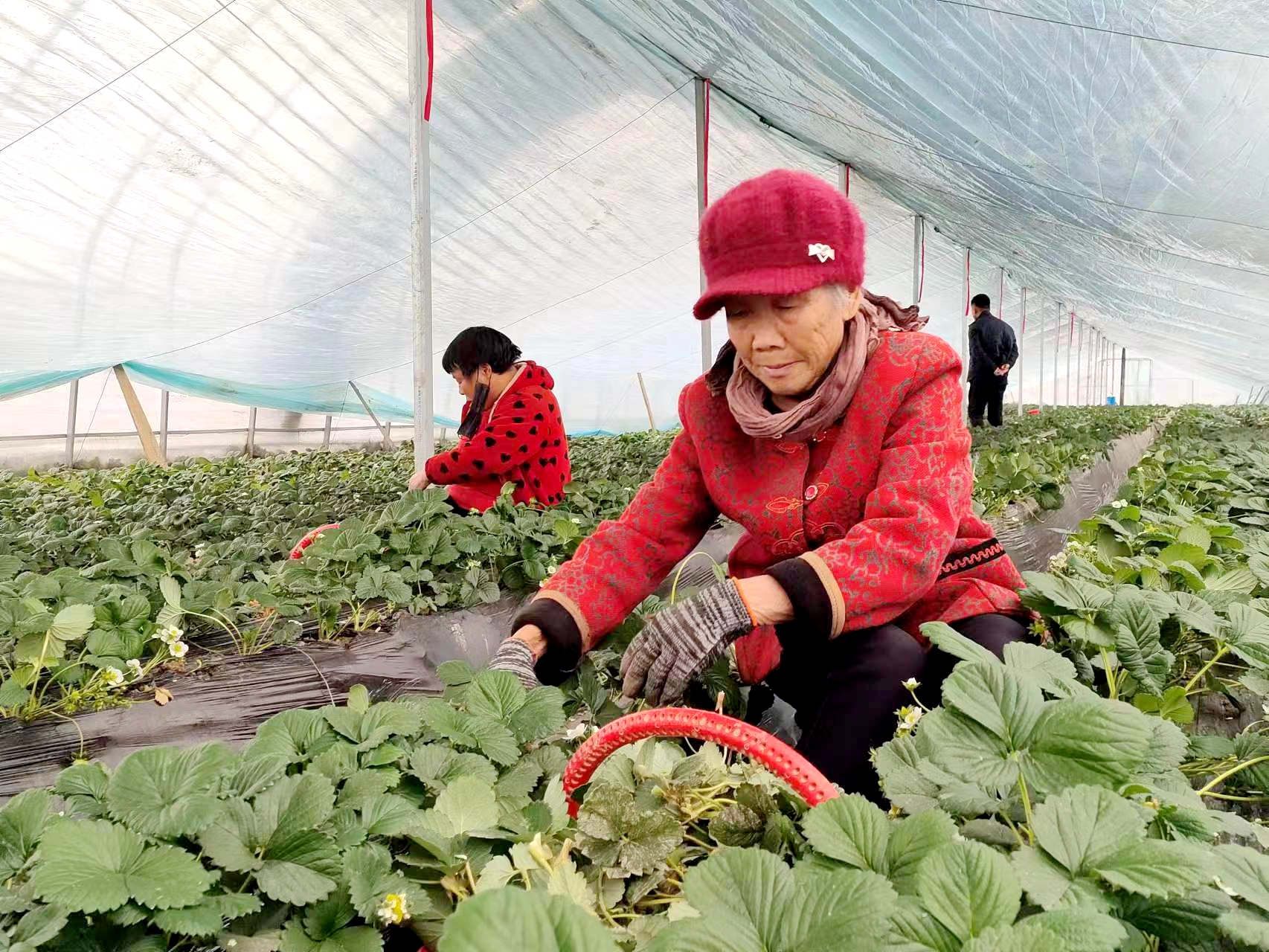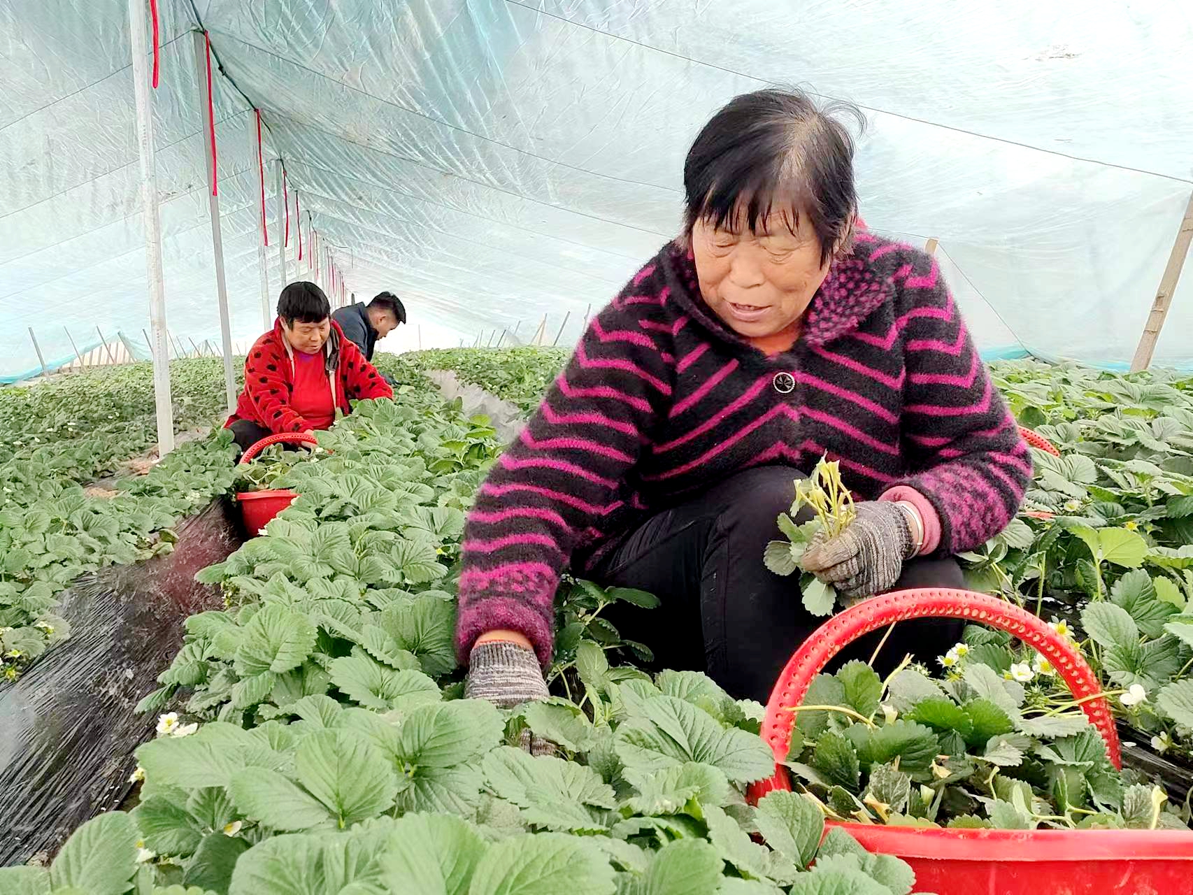 在田廣水的草莓采摘園,一股清香撲鼻而來。綠油油的草莓葉下,一顆顆鮮紅欲滴的草莓長勢喜人,十分誘人。這里的20多畝草莓已經(jīng)開始結(jié)果成熟上市?!俺醵乃贩N本來很少,我們大棚種植的‘紅顏’草莓香甜、肉厚、口感好,大人孩子都很喜歡吃。”田廣水說,草莓園成熟季雇用工人近30人,全部來自村里的留守婦女、老人及脫貧監(jiān)測戶。
