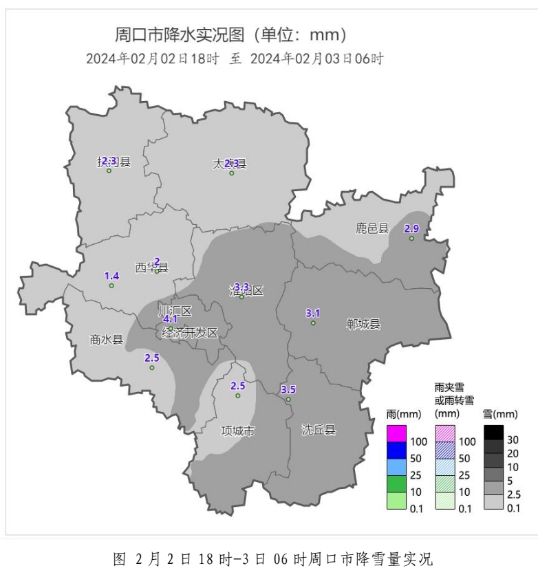 2日18時﹣3日06時:我市出現(xiàn)中到大雪,最大降雪量出現(xiàn)在川匯區(qū) 4.1 毫米。各國家站降雪量(毫米):川匯區(qū)4.1、沈丘3.5、淮陽3.3、鄲城3.1、鹿邑2.9、商水2.5、項城2.5、太康2.3、扶溝2.3、西華2.0、黃泛區(qū)1.4。