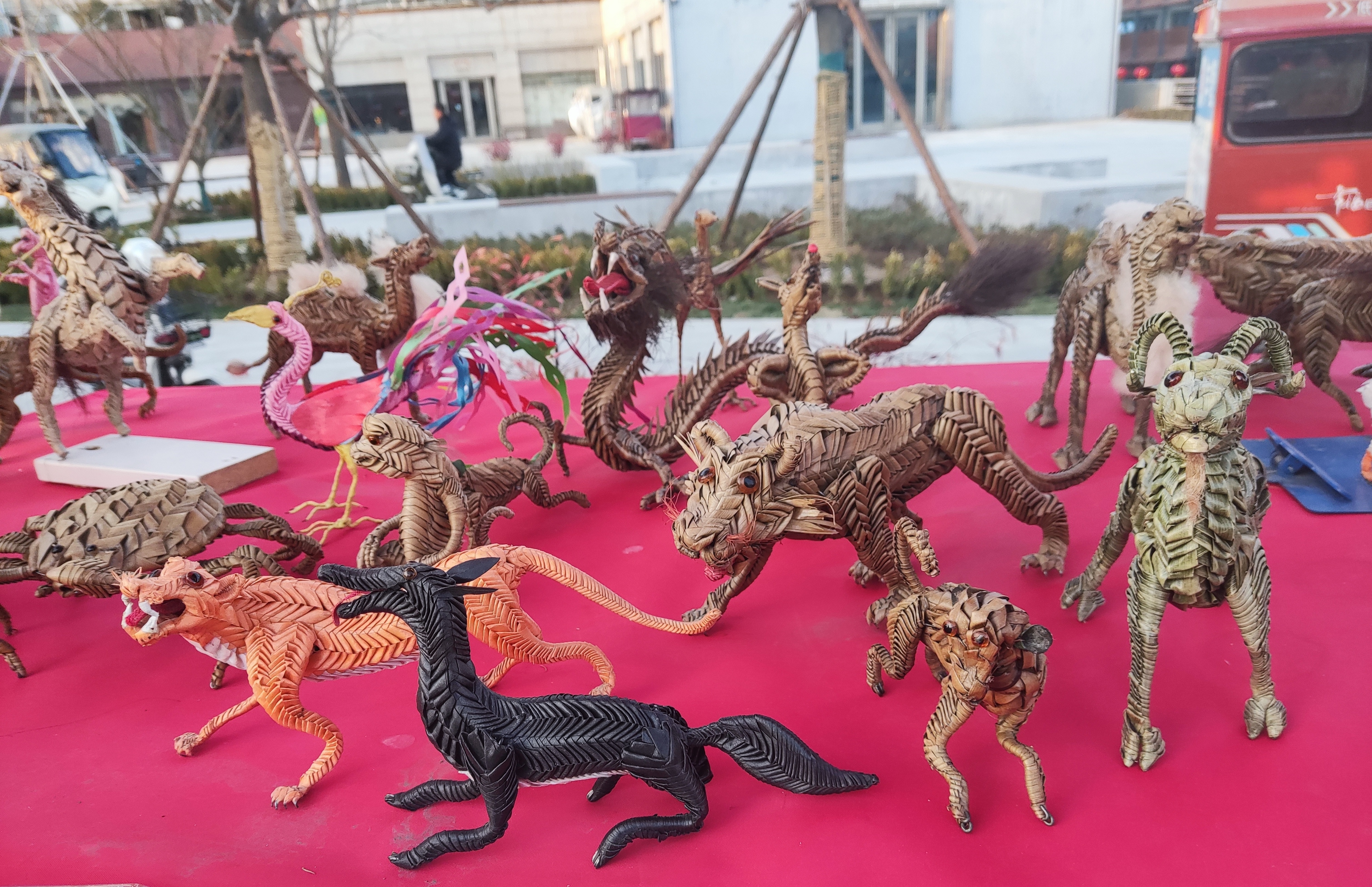 日前,在周口首屆“三川十館?春會”關(guān)帝廟歷史街區(qū)“古風(fēng)集市”上,“洪濤棕編”手藝人朱洪濤用棕櫚葉編織的各種動物造型作品,吸引眾多游客欣賞、購買。