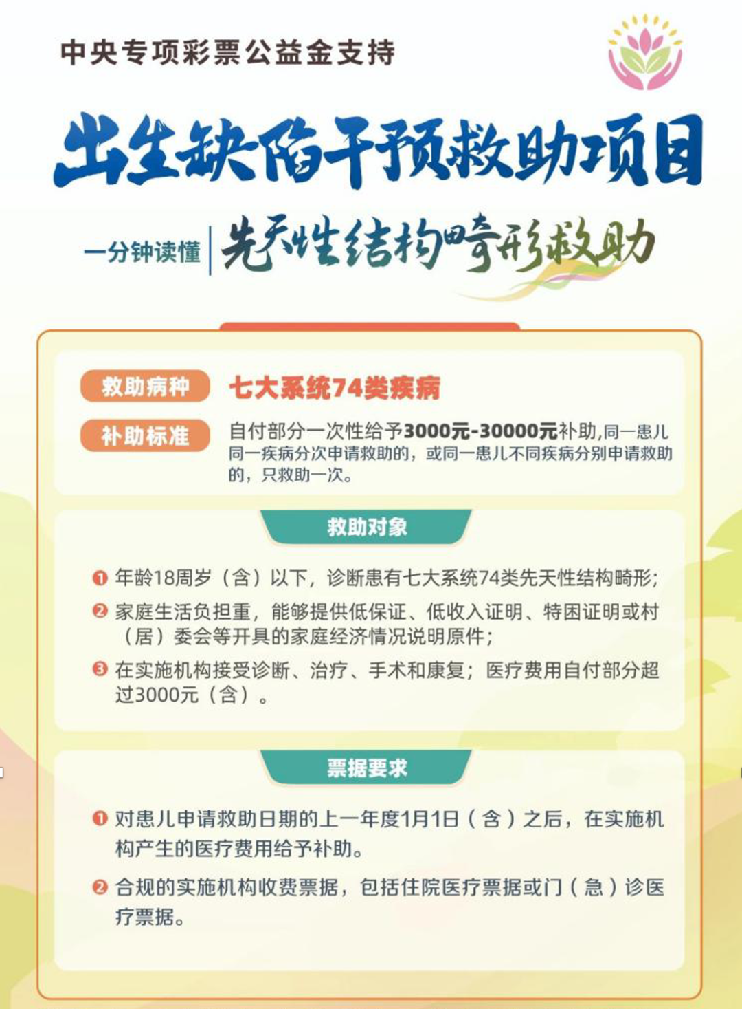 中央專(zhuān)項(xiàng)彩票公益金支持出生缺陷救助項(xiàng)目,旨在向患有遺傳代謝病、先天性結(jié)構(gòu)畸形和功能性出生缺陷等三類(lèi)出生缺陷疾病的經(jīng)濟(jì)困難家庭提供醫(yī)療費(fèi)用補(bǔ)助,減輕患兒家庭醫(yī)療負(fù)擔(dān)。該項(xiàng)目由衛(wèi)生健康委委托中國(guó)出生缺陷干預(yù)救助基金會(huì)組織實(shí)施。