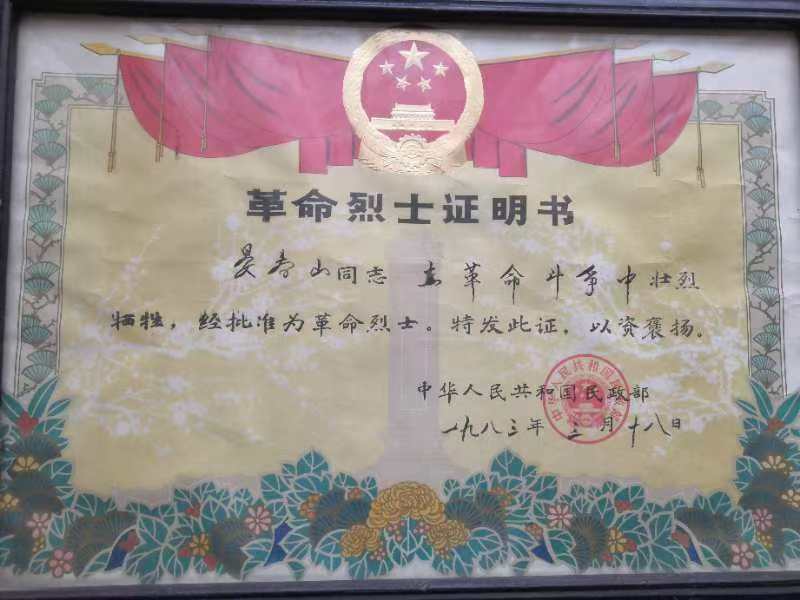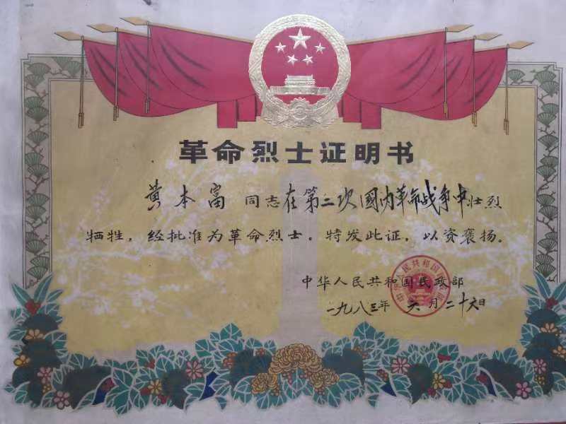 黃德耀的小爺爺黃成香于1935年3月在哥哥黃本富犧牲后的第2個(gè)月參加紅軍。1940年,黃成香在安徽省定遠(yuǎn)縣對日軍戰(zhàn)斗中英勇犧牲,尸骨無存,年僅17歲。