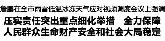本報訊 (記者 李鳳霞) 1月18日,市長詹鵬主持召開全市雨雪低溫冰凍天氣應(yīng)對視頻調(diào)度會議,強調(diào)要深入學(xué)習(xí)貫徹習(xí)近平總書記關(guān)于防災(zāi)減災(zāi)救災(zāi)的重要指示精神,貫徹落實省委和市委決策部署,以“時時放心不下”的責(zé)任感,扎實有效應(yīng)對雨雪低溫冰凍天氣,確保人民群眾生命財產(chǎn)安全和社會大局和諧穩(wěn)定。孔陽、朱向陽、張建黨、程若光、王文峰出席會議。