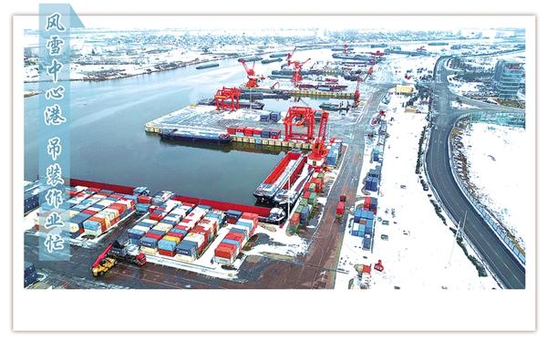 1月21日上午,白雪裝點(diǎn)下的周口中心港范營(yíng)作業(yè)區(qū)一片繁忙景象。碼頭上,運(yùn)輸車(chē)輛往來(lái)穿梭,集裝箱吊裝作業(yè)有序進(jìn)行,呈現(xiàn)了新年伊始港口生產(chǎn)的蓬勃?dú)庀蟆?/p>