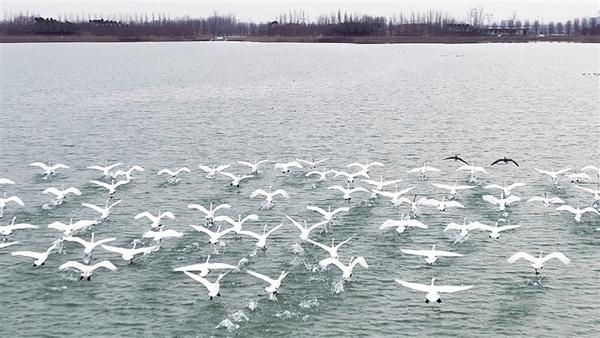 近日,市城鄉(xiāng)一體化示范區(qū)引黃調(diào)蓄湖迎來一批北飛回遷的天鵝。這群天鵝或逐日飛翔,或踏水而歌,或悠閑覓食,盡情享受遷徙途中的休閑時(shí)光,吸引眾多群眾前來觀賞。