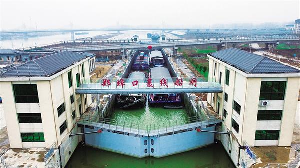 鄭埠口樞紐工程是沙潁河周口段關(guān)鍵性航運(yùn)樞紐工程。近年來,通過航道疏浚、船閘擴(kuò)建等升級(jí)改造工程,鄭埠口樞紐通航能力顯著提升,為周口從“黃土經(jīng)濟(jì)”向“藍(lán)海經(jīng)濟(jì)”轉(zhuǎn)型提供了有力支撐。圖為從周口港出發(fā)的貨船等待通過鄭埠口復(fù)線船閘。