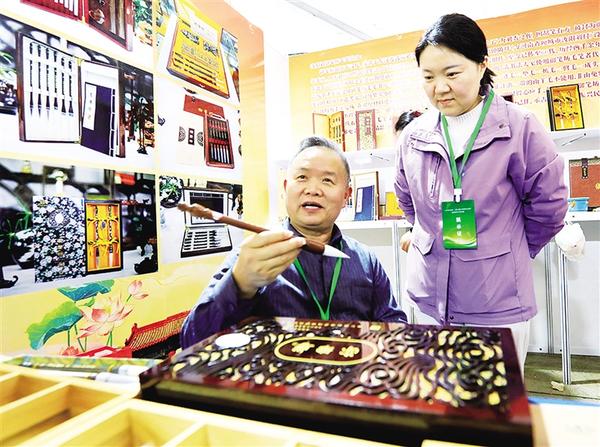 3月1日,在淮陽伏羲文化廣場非遺展示大廳,省級非物質文化遺產代表性項目汝陽劉毛筆——御筆坊第67代制筆傳承人劉愛華(右)和父親劉好奎展示毛筆新品。