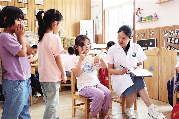 5月19日,扶溝縣中醫(yī)院眼科醫(yī)務(wù)人員來(lái)到扶溝縣直幼兒園為小朋友檢查視力。近日,扶溝縣多家幼兒園開展“愛眼護(hù)眼從小做起”主題活動(dòng),邀請(qǐng)醫(yī)務(wù)人員為小朋友講解眼科知識(shí),并為小朋友進(jìn)行視力檢查。